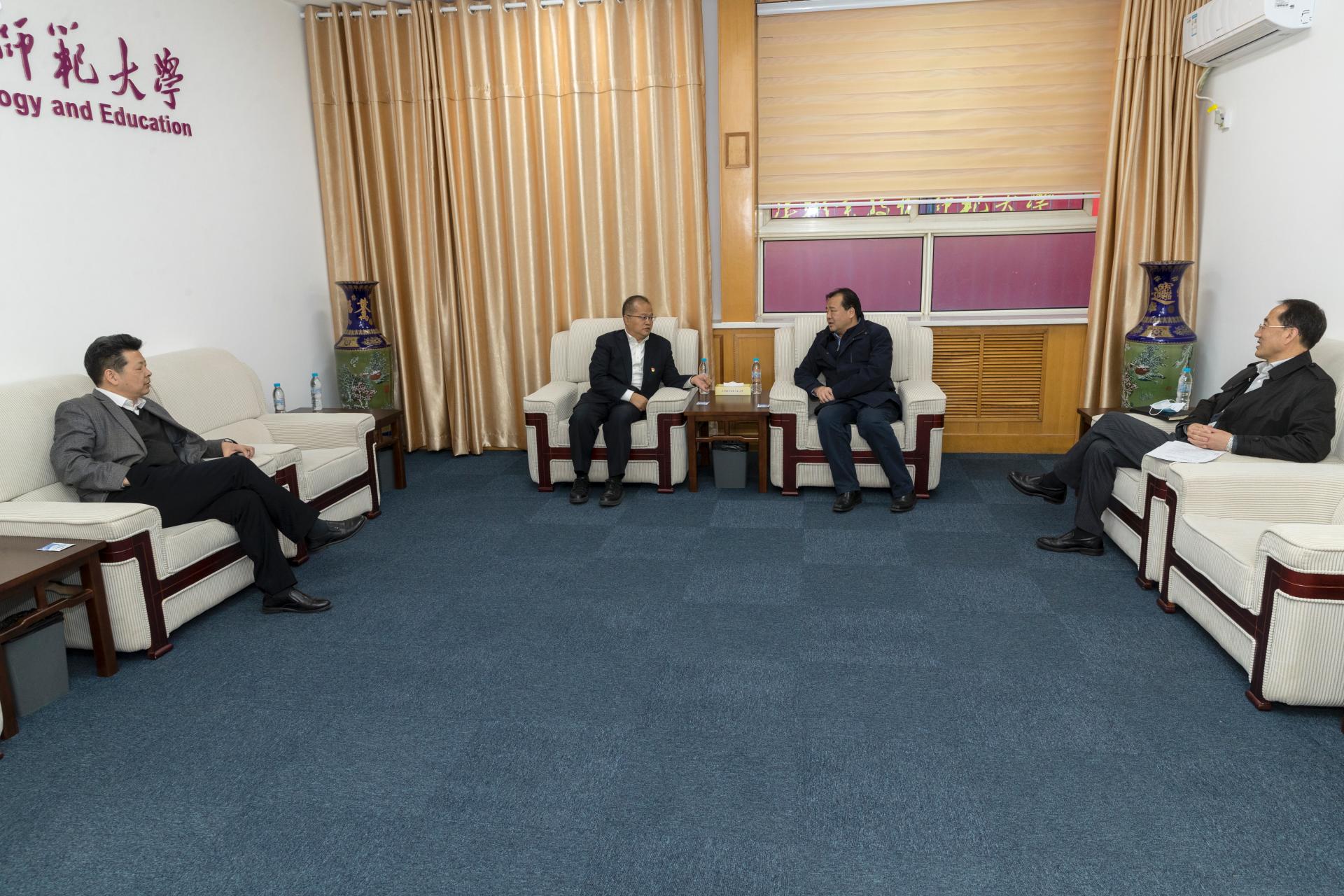 讲座前,校党委书记张金刚,副校长陈建国、阎兵与白学军座谈。