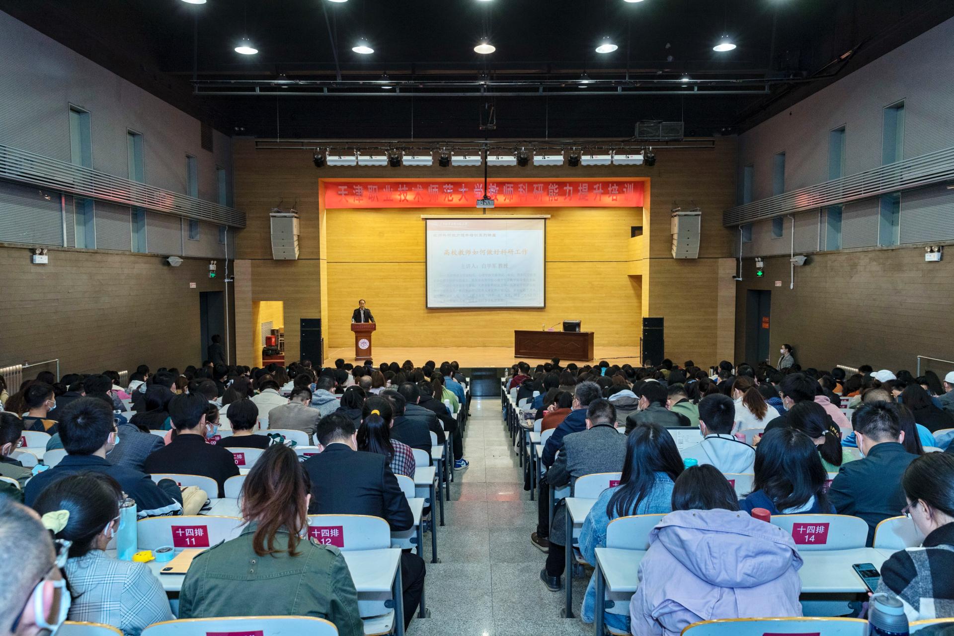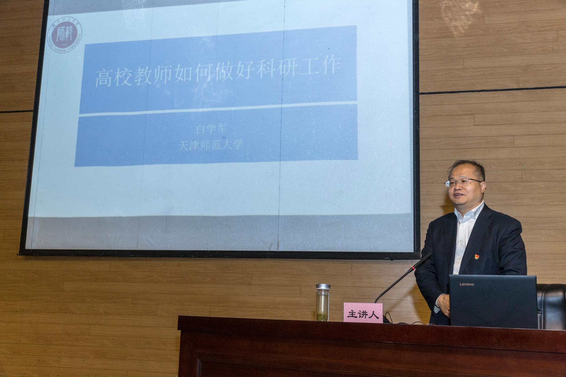 本网讯【通讯员 赵建斌】为营造良好的学术研究氛围,提高教师的科研水平,促进教师教育教学高质量发展,党委教师工作部(教师发展中心)组织开展教师能力提升系列培训,11月3日下午举办首场讲座,邀请天津师范大学副校长白学军教授作题为《高校教师如何做好科研工作》的专题讲座。各学院中青年教师,科研处、学科办、教务处、战略办、宣传部、教工部等部门负责同志360余人参加培训。讲座由副校长陈建国主持。