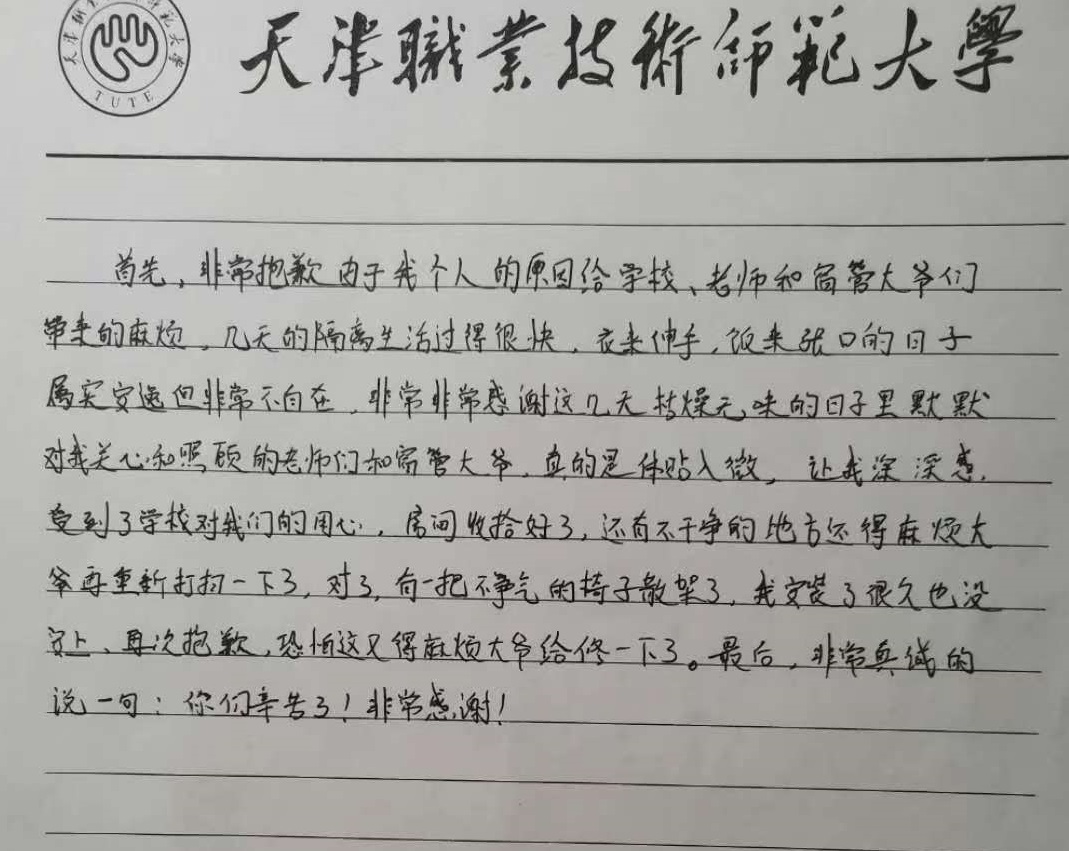 医务室、车队等后勤处相关科室党员和老师的专业处置、热心服务、耐心解释,帮助同学们充分了解学校疫情防控的各项规定和应急处置流程,深深感受到学校的关怀和温暖。有些同学从最初不情愿到隔离点隔离观察,到最后离开时向值班老师们表达满满的感激之情,离开隔离点同学们感谢的话语是对后勤人辛勤付出的充分肯定。甚至有隔离点以外的同学也表示,想要去隔离点住几天“感受”一下。