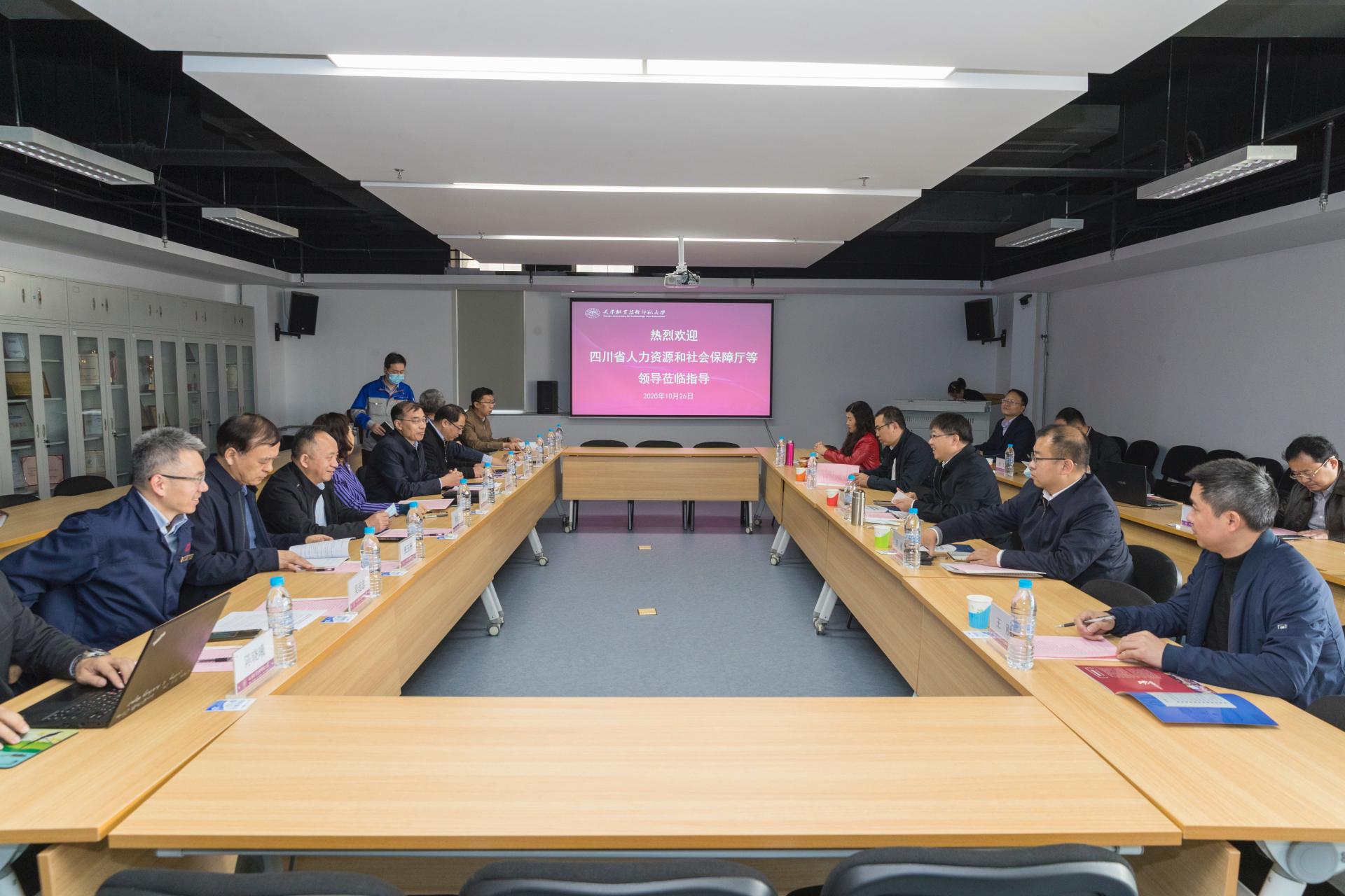 王勇一行与孙奇涵副校长就世赛中国(天津)研究中心的运作方式和研究成果、职业技能竞赛管理体系建设、竞赛集训基地建设的经验做法作了深入座谈交流。孙奇涵代表学校对四川省人社厅到校考察调研表示欢迎,并就学校办学特色,专业设置、招生就业情况进行了介绍。双方就进一步扩大合作、开展技术交流指导及做好相关工作交换了意见。