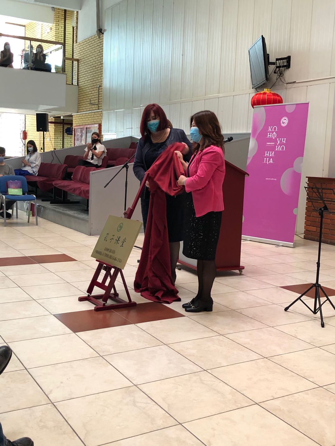 本网讯【通讯员 申丽】10月5日,我校承办的波黑巴尼亚卢卡大学孔子学院开设的首个孔子课堂揭牌仪式在巴尼亚卢卡文法学校举行。巴尼亚卢卡文法学校校长维特女士和巴尼亚卢卡大学孔子学院中方院长申丽共同为孔子课堂揭牌,这是巴尼亚卢卡大学孔子学院在波黑当地开设的第一所孔子课堂,标志着巴尼亚卢卡大学孔子学院迈上新台阶。