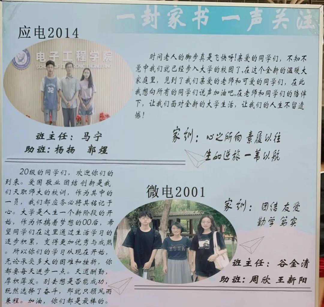 电子工程学院班主任老师与助理班主任共同制定致新生的“暖心家书”,为班级提出励志家训,使新生爱班如家,营造和谐气氛,增强新生的归属感。