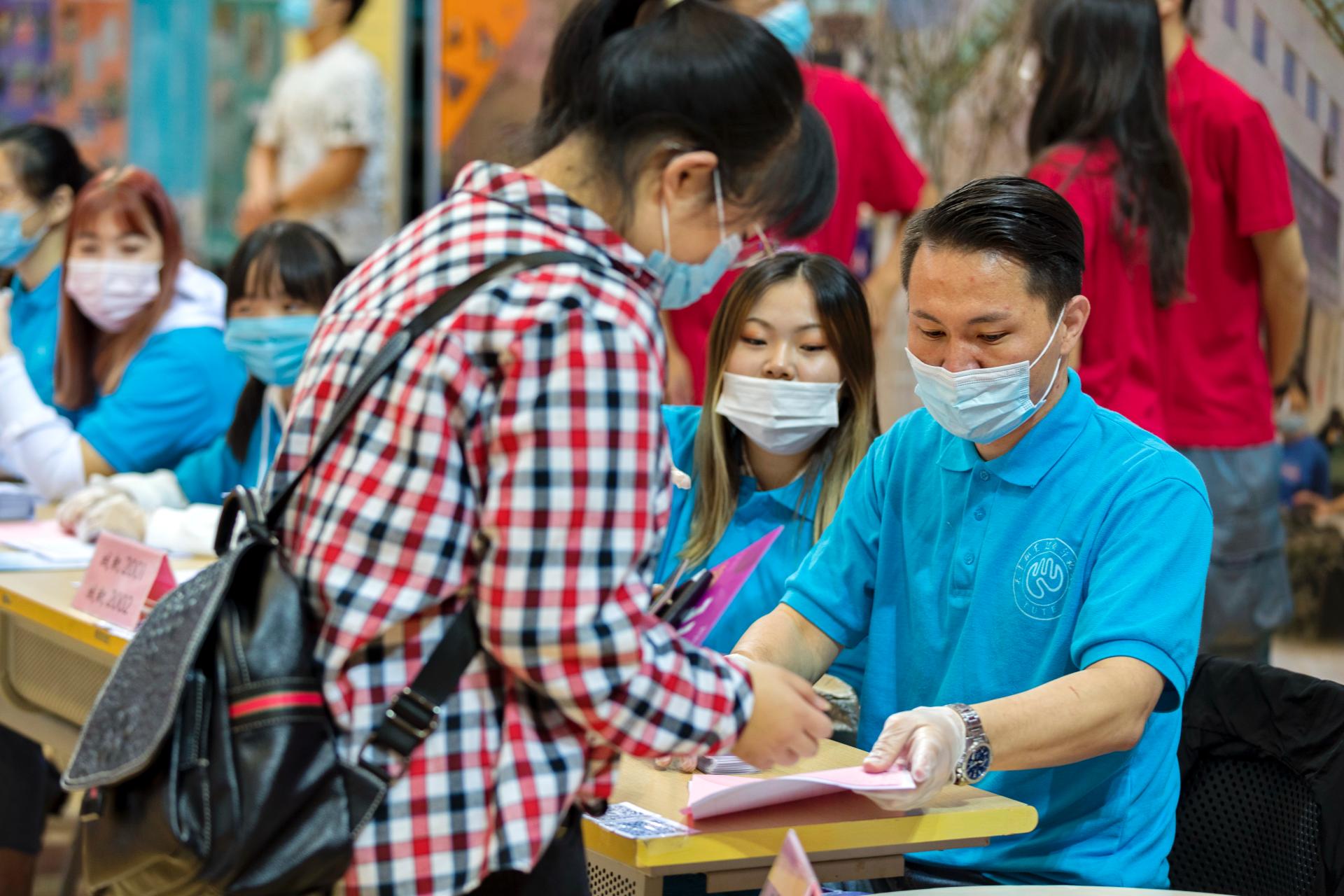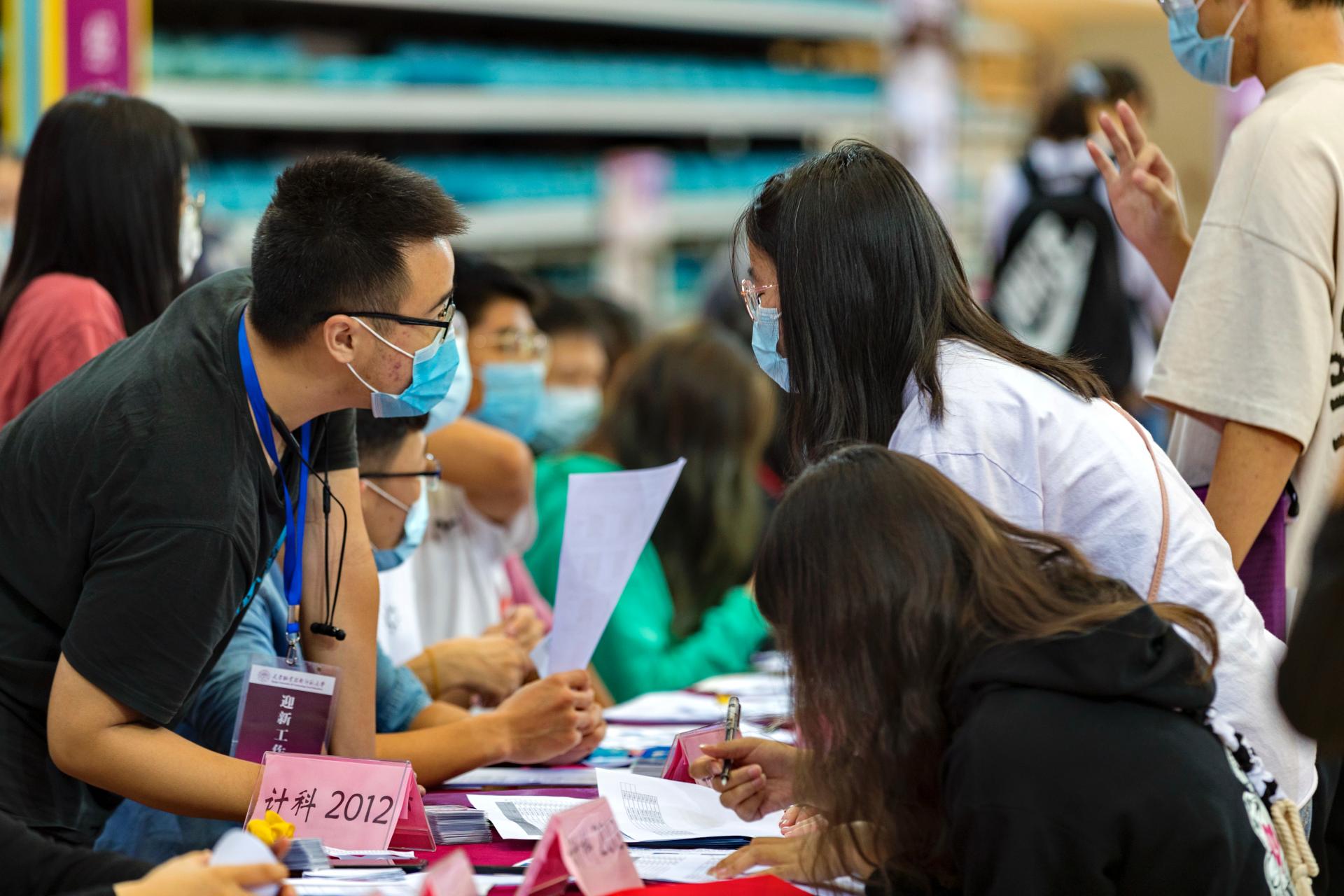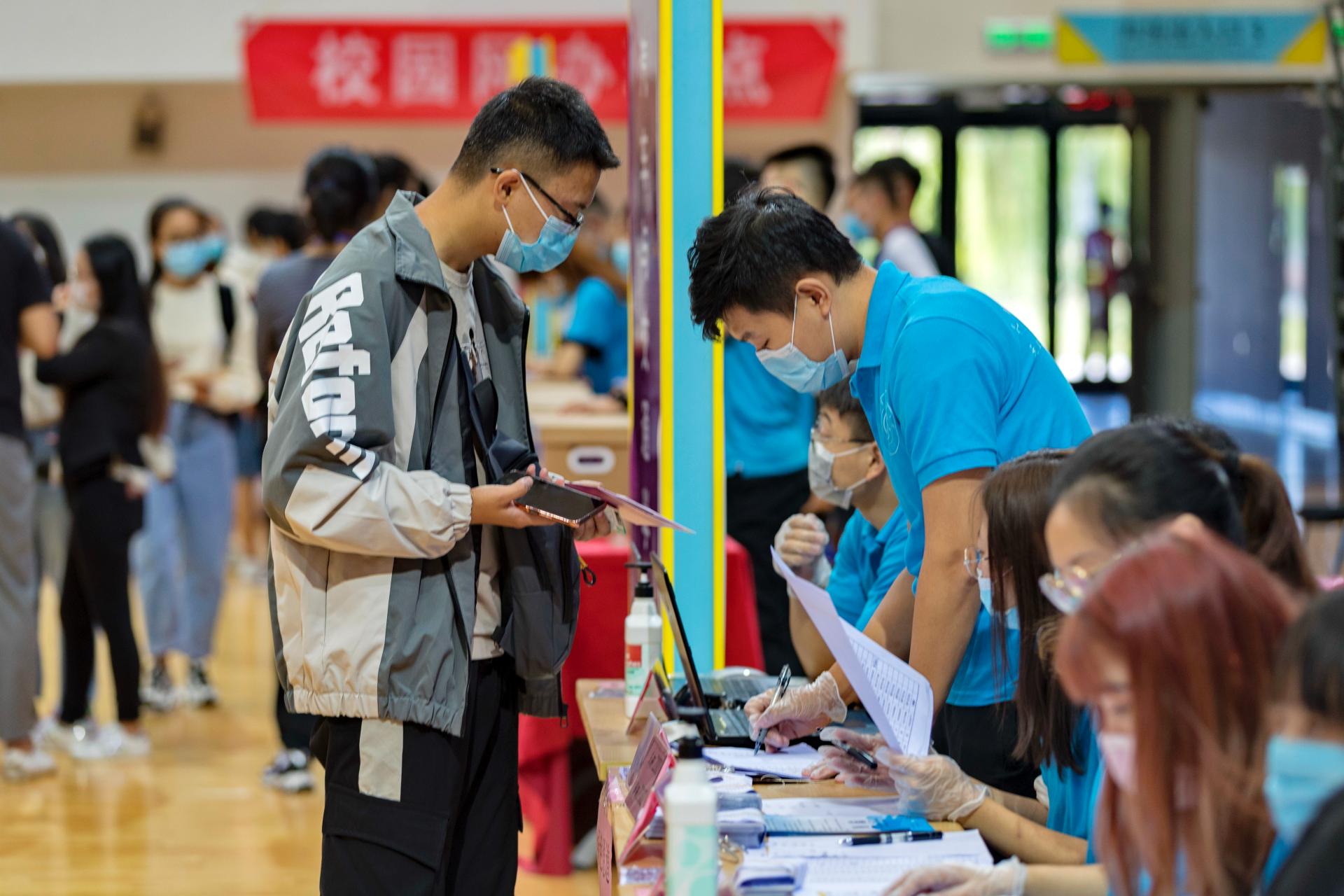 各学院在体育馆设立迎新报到站,迎新志愿者帮助新生完成报到和注册。新生经人脸识别系统识别通过后,交验录取通知书,领取“一站式”服务文件袋。