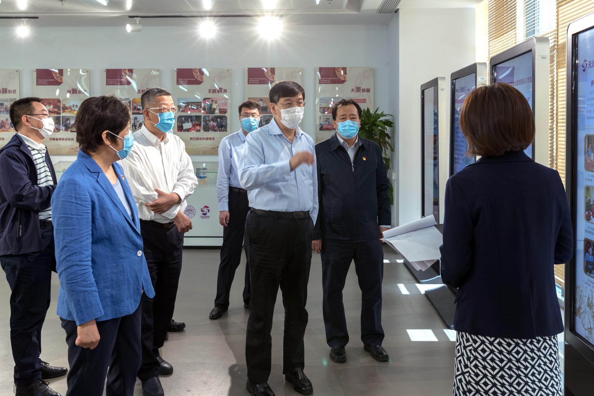 阴和俊一行先后深入学校校史展、天津市少数民族学生管理服务工作室、工程实训中心等,实地察看了解相关情况。随后,阴和俊主持召开座谈会并作讲话。会上,张金刚汇报了相关工作情况。首届全国高校思想政治理论课教学展示活动一等奖获得者、马克思主义学院教师王晓霞老师,教育部全国党建工作样板支部、电子工程学院电科实训教工党支部书记杨旭老师作了发言。