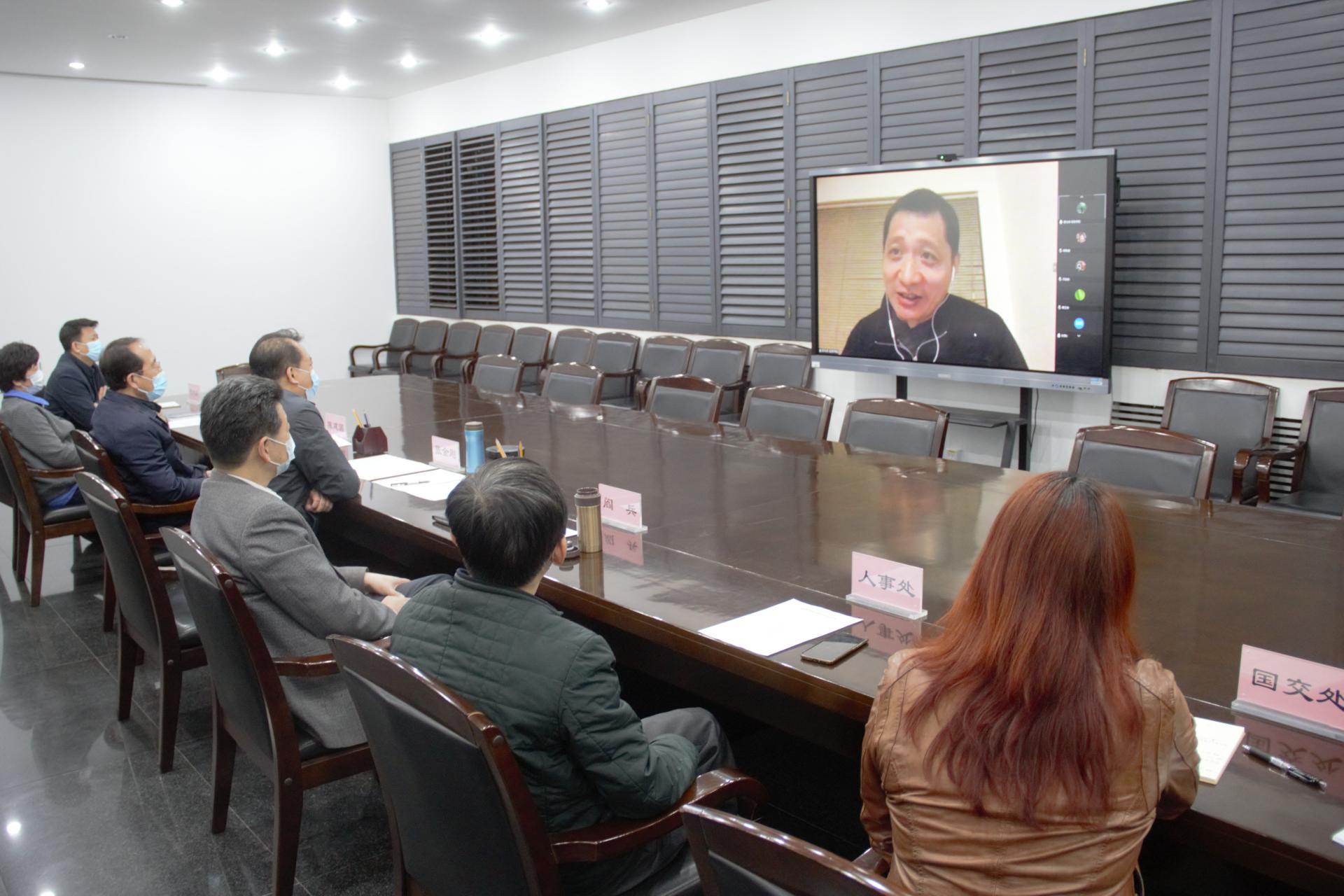 援助埃塞俄比亚职业教育孔子学院教师、机械工程学院高洋,援助波黑巴尼亚卢卡大学孔子学院教师、外国语学院高阳分别汇报了援助工作所在地的疫情及近期援外工作开展情况,以及我校派驻教师的生活和工作情况。境外访学教师代表、机械工程学院朱学明、职业教育学院孙翠香、信息技术工程学院菅光宾、职业教育教师研究院张洪华分别介绍了出国研修工作生活情况和当地社区疫情防控情况。他们均表示,感谢学校的关心关爱,一定牢记学校领导的温暖叮嘱,切实注意安全、做好自身防护、保重身体,坚持做好援外和研修工作。