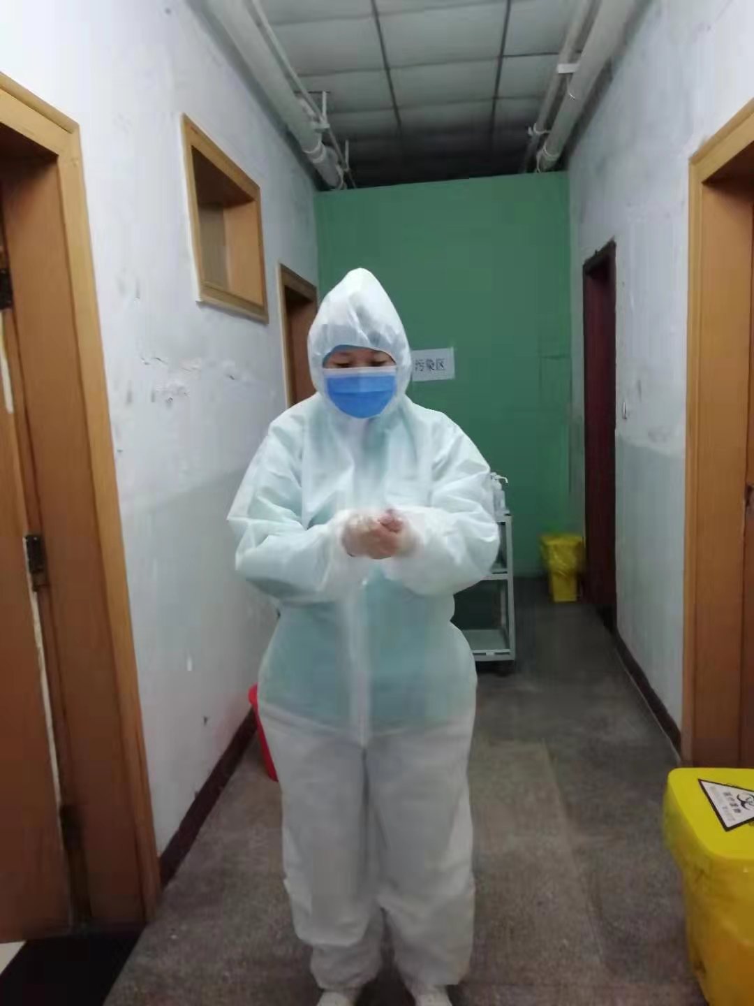 | 图为肖妈妈在医院穿着防护服 |