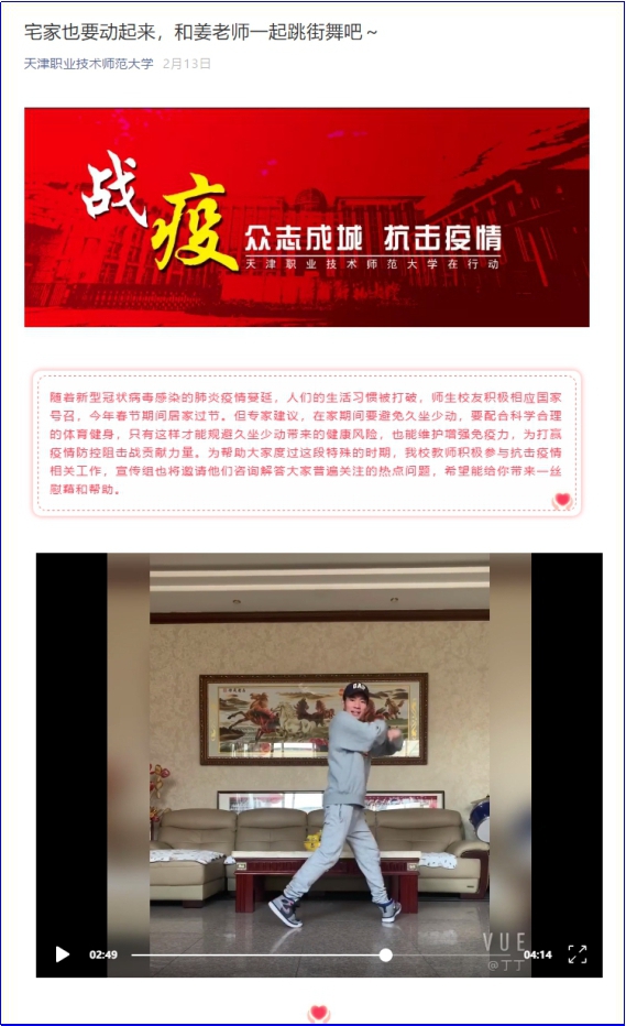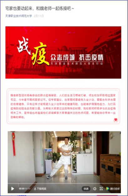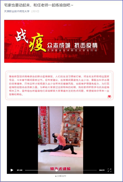 避免疫情,除了要阻断传播路径,还需要加强自身锻炼,提高抵抗力。为丰富教职工居家不外出期间的文体生活,体育教学部动员党员及教师充分利用居家环境,结合项目特点制作不受场地局限,简单易学的居家锻炼小视频《宅家也要动起来,和体育老师一起锻炼》,定期在学校官微上推送,从而号召大家运动防疫。截止目前,已推送三期,有姜贤国老师的街舞视频,魏昆仑老师精心示范的八段锦,任楠老师细心讲解的瑜伽体位法,受到了师生的喜欢。同时任楠老师受天视体育频道邀请,做客《科学健身一点通》栏目,为全市人民提供健身指导。