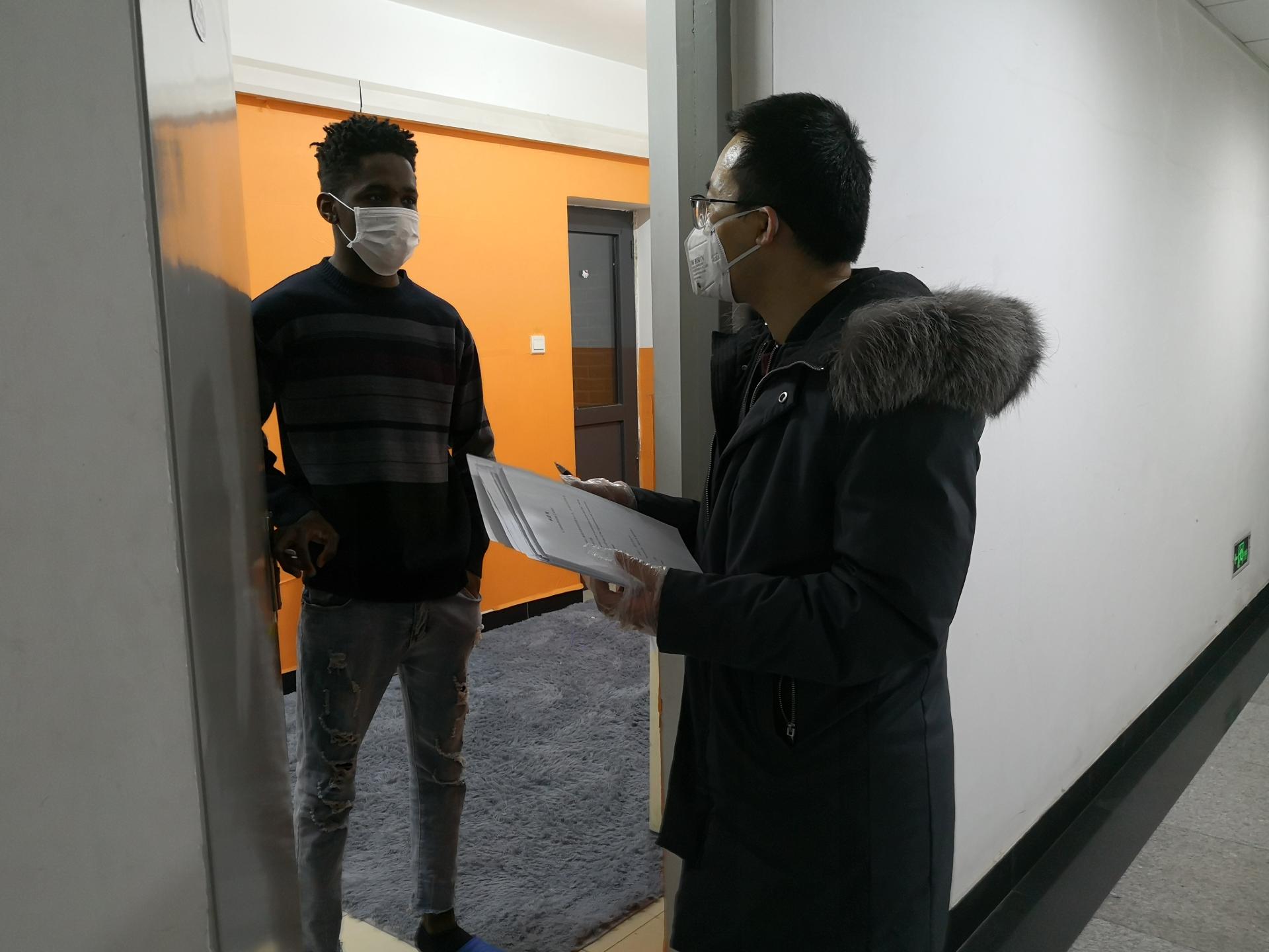 两个关键词——“唯一”和“重要”,使得国际学生疫情防控工作始终关系着学校疫情防控工作大局,也始终牵动着学校领导的心。校党委书记张金刚,校党委常委、副校长陈建国、阎兵,多次来到作为疫情防控前线的国际学生公寓指导查国际学生应对新型冠状病毒感染肺炎防控工作,做出重要指示,强调要切实保障外籍人员的身体健康和生命安全,维护学校安全稳定。派驻纪检监察组组长张志远专程来到国交中心督导疫情防控相关情况,对国际学生疫情防控提出明确要求。在学校领导的高度重视和亲切关怀下,国际交流处全体干部群众快速响应,立即行动,吹响了抗击新型冠状病毒疫情、守卫学校国际学生安全的冲锋号。