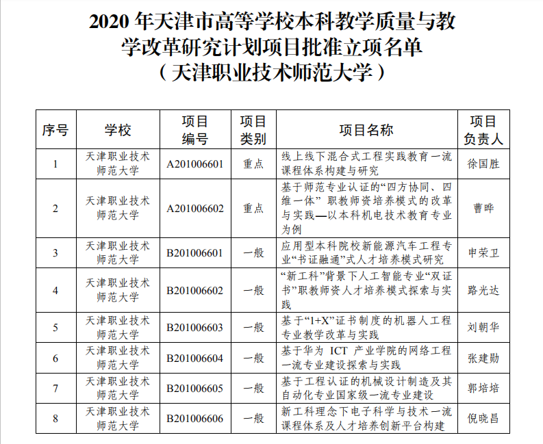 根据《市教委关于开展2020年天津市高等学校本科教学质量与教学改革研究计划项目立项申报工作的通知》(津教高函〔2020〕19号)要求,经个人申请、学院推荐、学校初审、市教委评审且公示无异议后,市教委批准184个项目为2020年天津市高等学校本科教学质量与教学改革研究计划项目。我校徐国胜教授主持的《线上线下混合式工程实践教育一流课程体系构建与研究》、曹晔教授主持《基于师范专业认证的“四方协同、四维一体” 职教师资培养模式的改革与实践——以本科机电技术教育专业为例》2个项目获批重点项目,申荣卫教授主持的《应用型本科院校新能源汽车工程专业“书证融通”式人才培养模式研究》等6个项目获批一般项目。