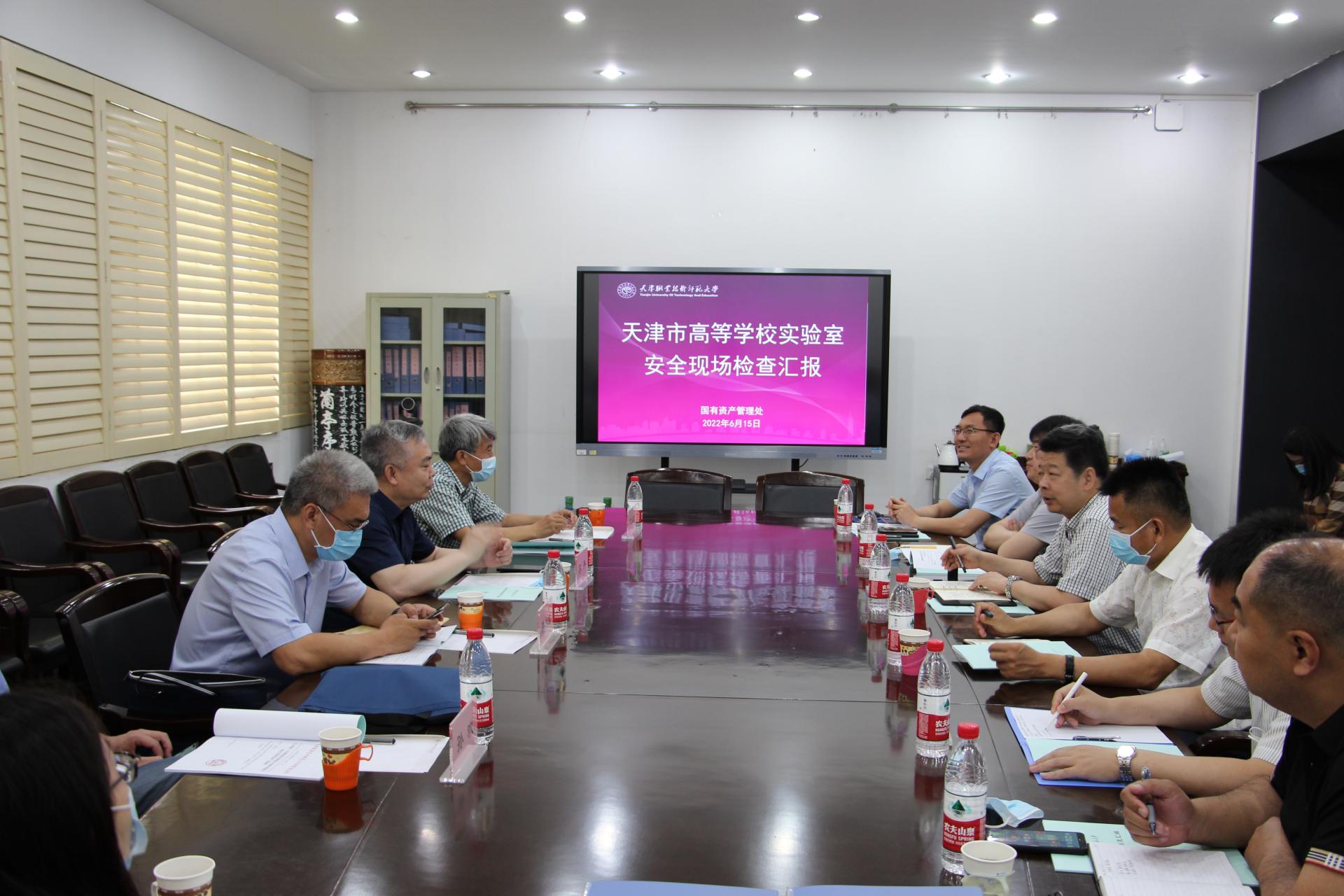 本网讯【通讯员 冯雪】6月15日上午,市教委科研处处长苏丹带领天津大学资产与实验室管理处副处长韩冰霜、天津中医药大学王益民教授、天津商业大学国有资产与实验室管理处副处长孙欢组成的市教委高校实验室安全现场检查组,对我校教学、科研实验室安全管理工作进行检查。实验室安全检查汇报会在行政楼1002会议室举行。校党委常委、副校长阎兵出席会议并讲话,国资处处长董恩国主持。