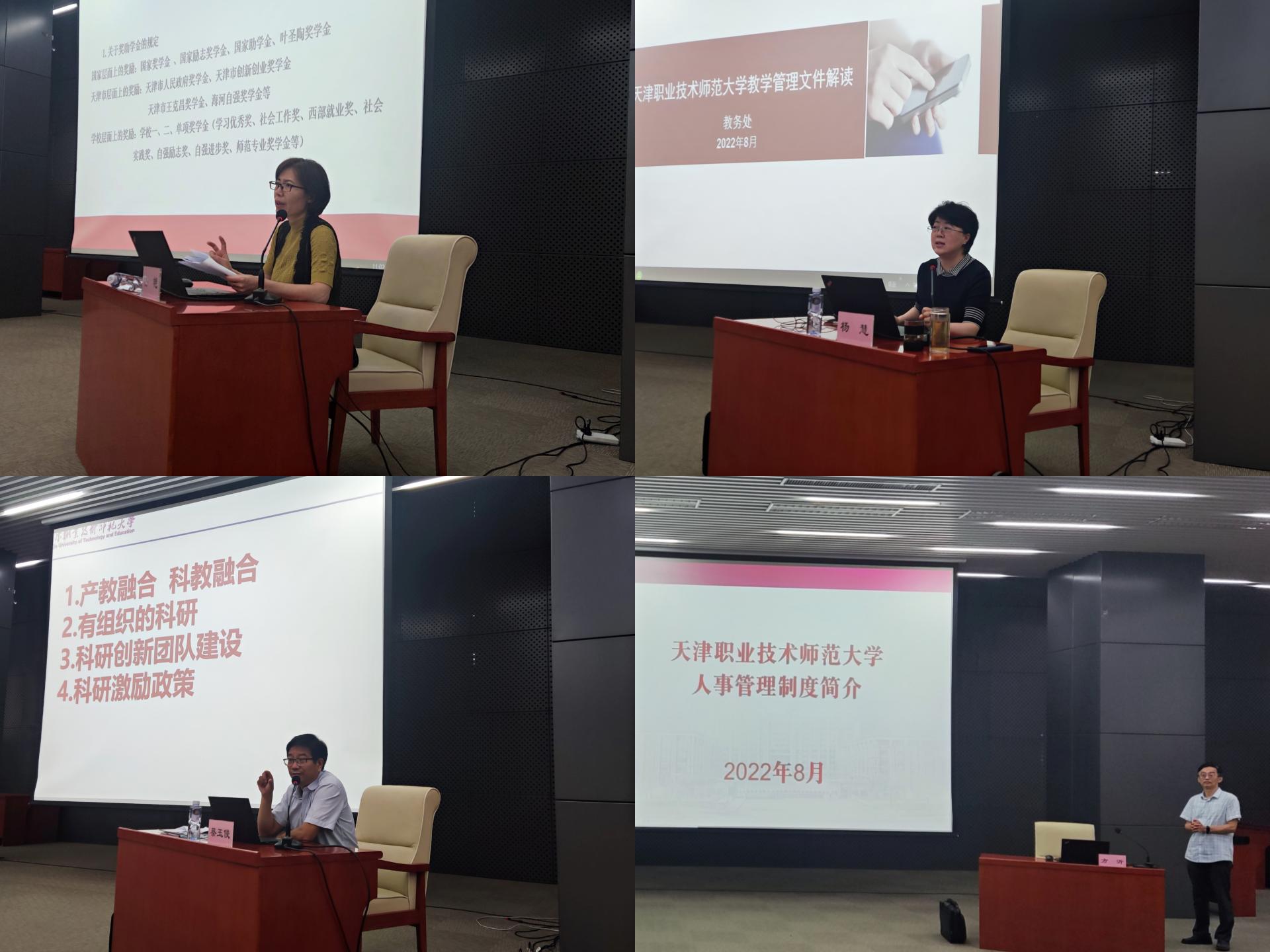 原校党委书记孟庆国作题为“学校定位与办学特色”的讲座。讲座从校徽含义和校歌创作讲解入手,以学校发展亲历者的视角回顾了学校的建校史、奋斗史和发展史,讲述了学校独特的办学理念和鲜明的办学特色,为新入职教师上了一堂生动的校史校情课。