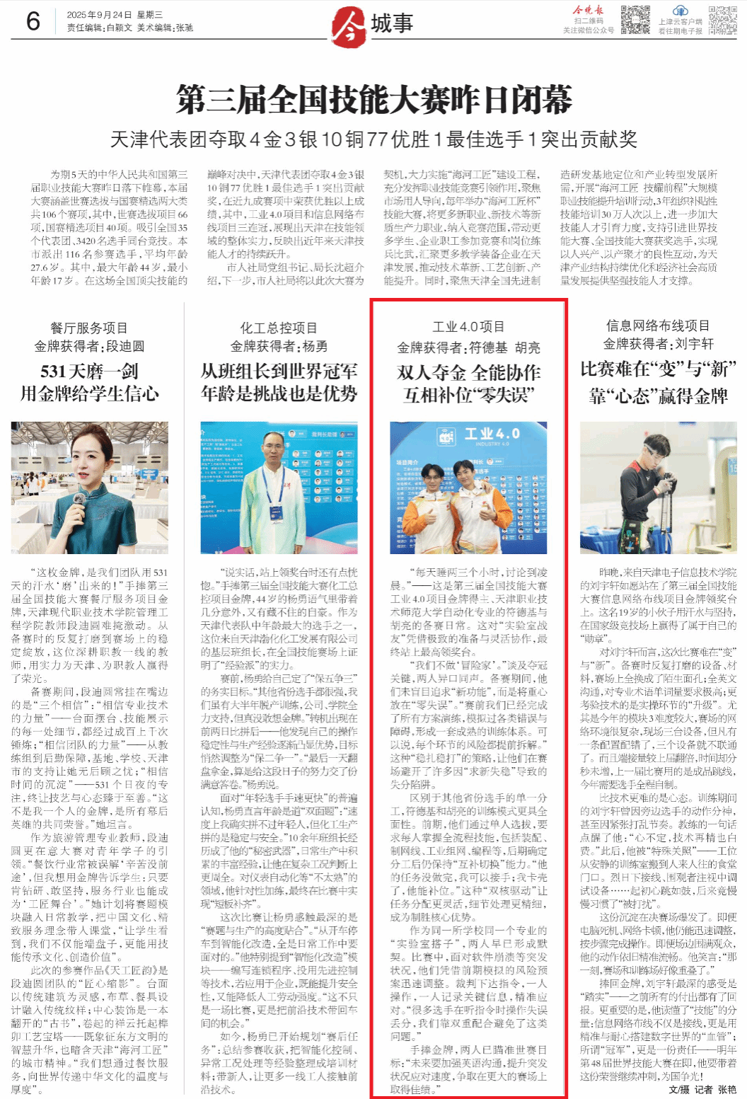 本网讯【通讯员 李硕】9月24日,《今晚报》“天津队勇夺四金 听听冠军吐心声”报道我校自动化与电气工程学院学生符德基与胡亮在第三届全国技能大赛工业4.0项目上夺金的故事。