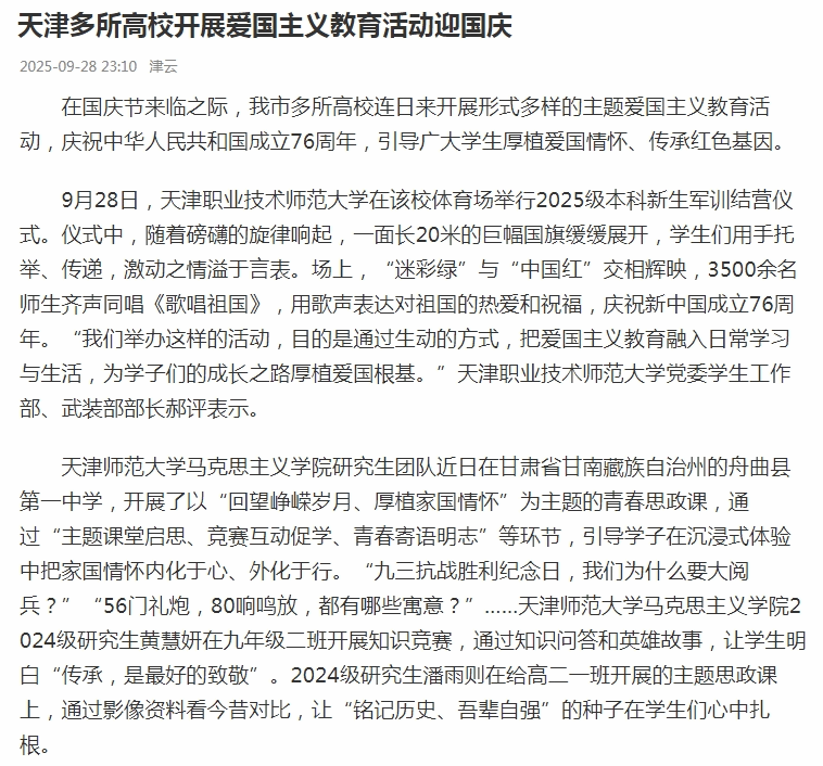 本网讯【通讯员 李硕】9月29日,津云以“天津多所高校开展爱国主义教育活动迎国庆”为题报道我校举行爱国主义教育活动,庆祝中华人民共和国成立76周年。