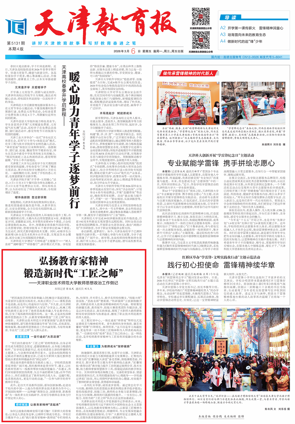 本网讯【通讯员 刘欠欠】3月6日,《天津教育报》头版以“弘扬教育家精神 锻造新时代‘工匠之师’——天津职业技术师范大学教师思想政治工作侧记”为题报道我校教师思想政治工作取得的一系列扎实成果。