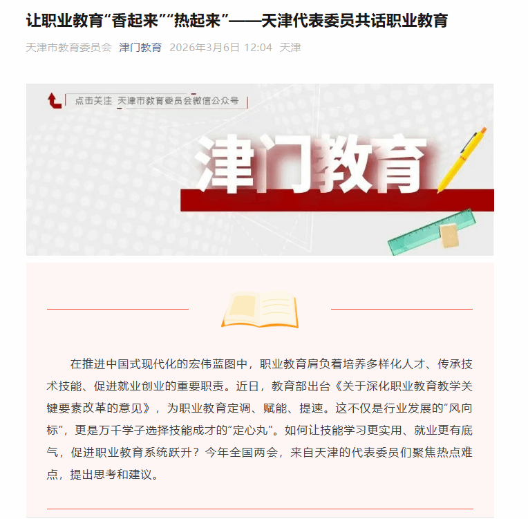 本网讯【通讯员 党萱】3月6日,津门教育微信公众号刊登全国人大代表、我校副校长王劲松出席2026年全国两会的提案建议。