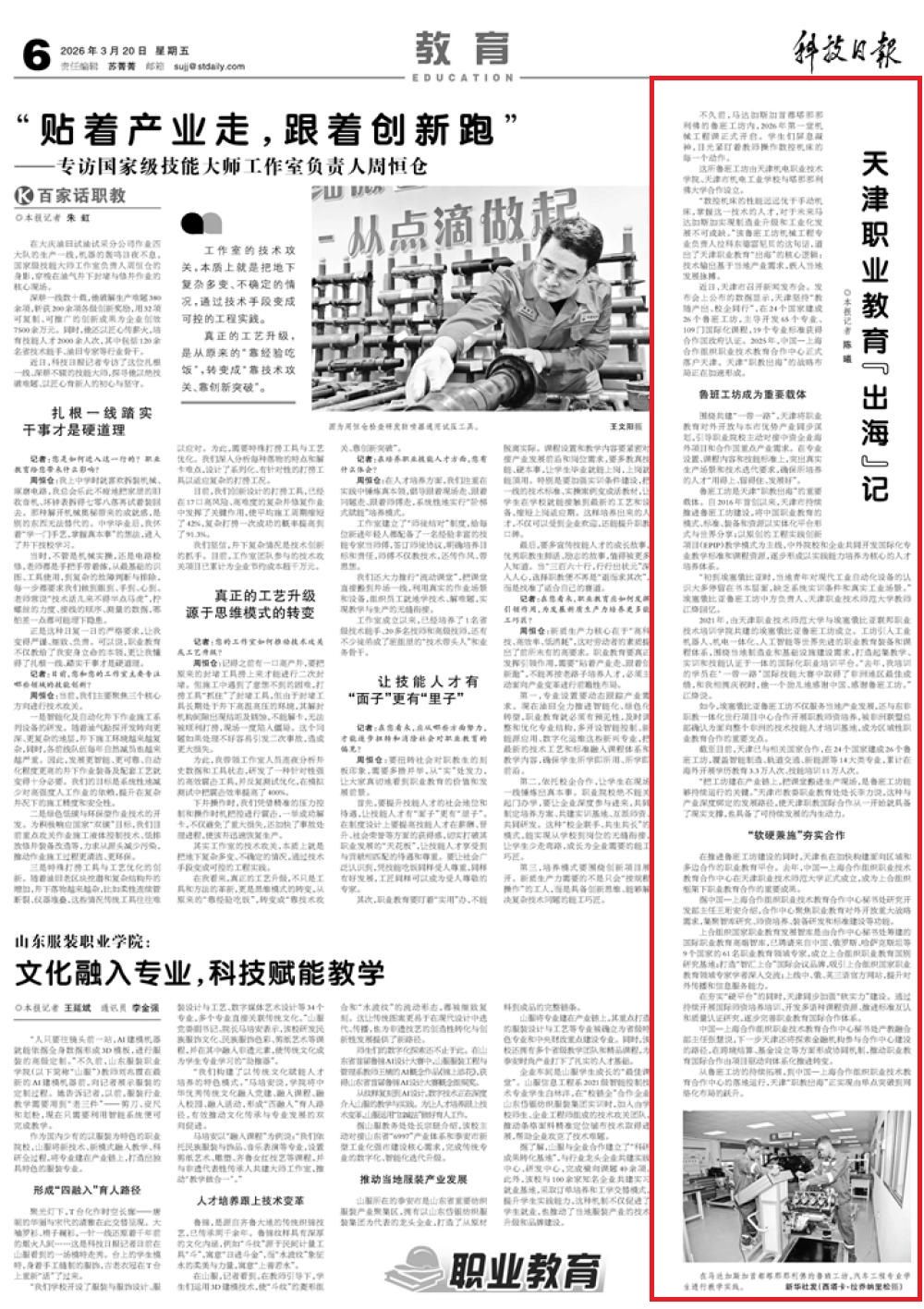 本网讯【通讯员 陈明】3月20日,《科技日报》以“天津职业教育‘出海’记”为题报道我校援建的埃塞俄比亚鲁班工坊,以及落户在学校的中国—上海合作组织职业技术教育合作中心推动职业教育"出海”,为服务当地产业发展需求培养人才。