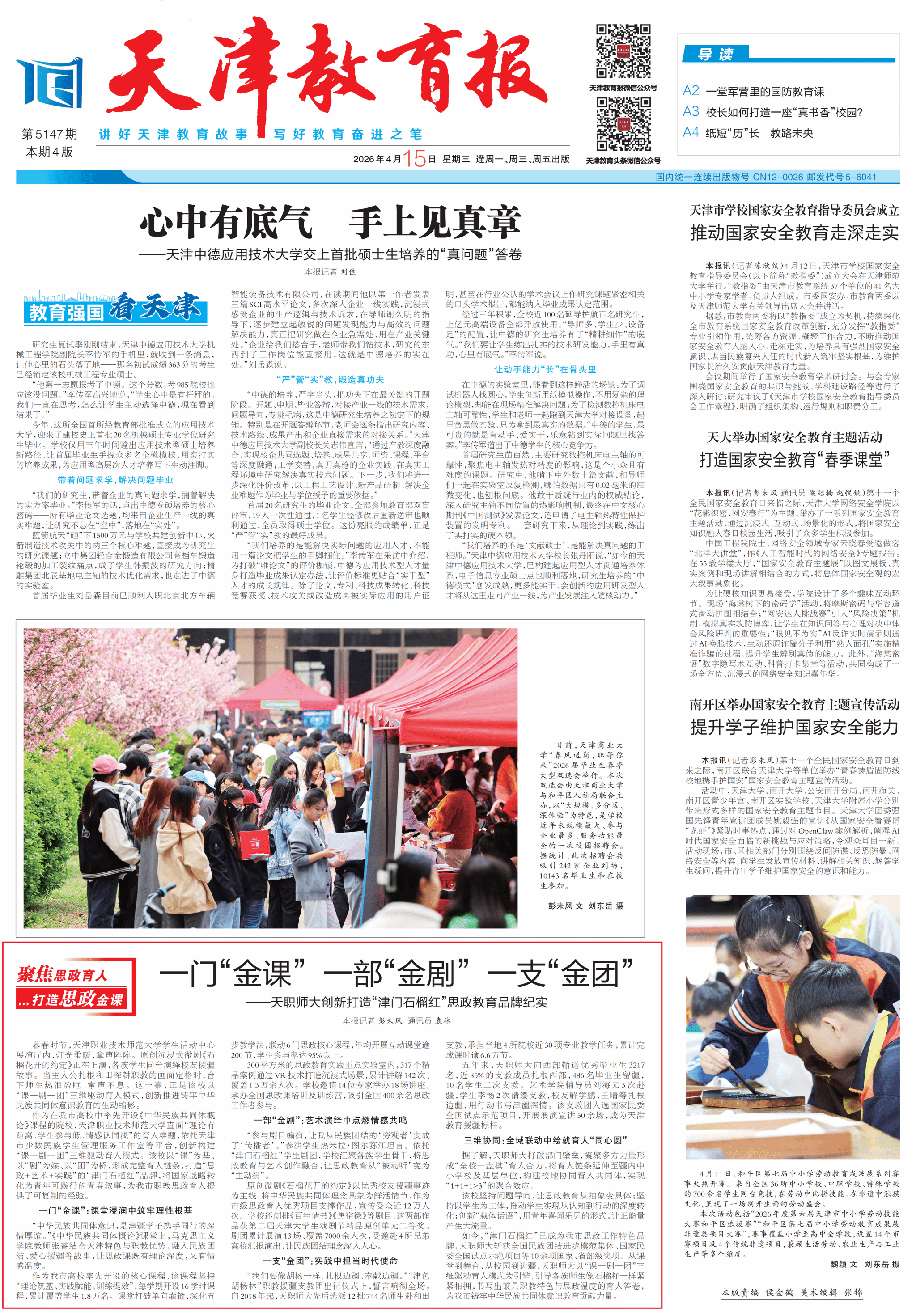 本网讯【通讯员 李硕】4月15日,《天津教育报》头版以“一门‘金课’ 一部‘金剧’ 一支‘金团’”为题,报道我校创新打造“津门石榴红”思政教育品牌纪实。