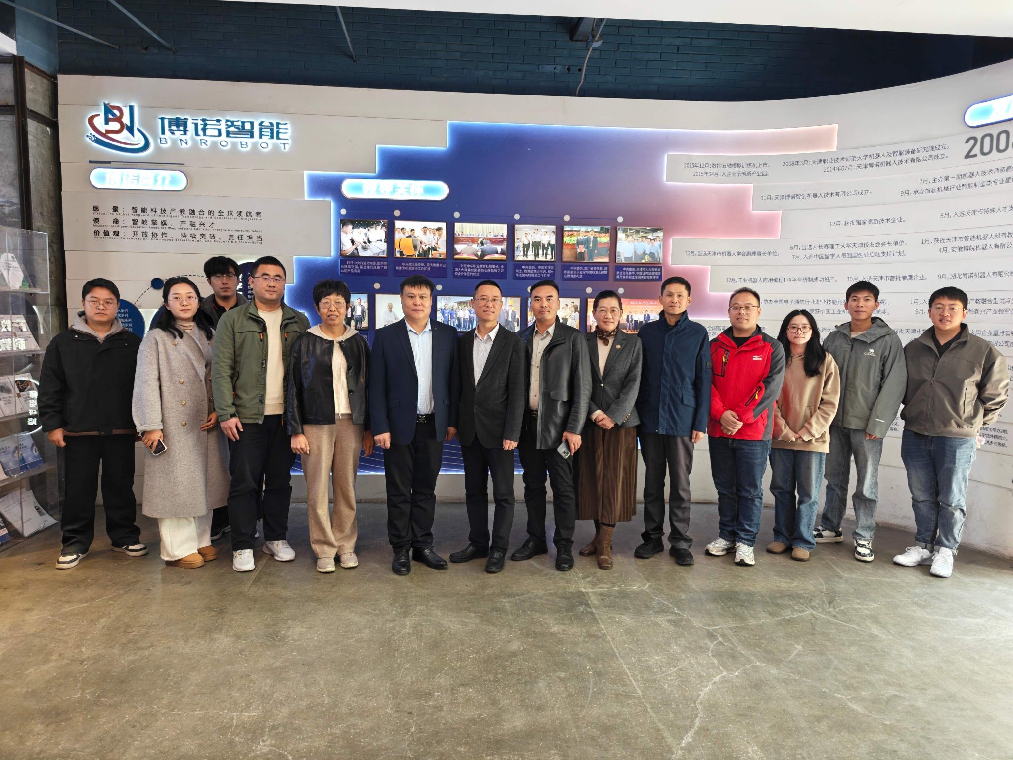 天津博诺智创机器人技术有限公司总经理、我校优秀校友周旺发热情接待了学院到访人员,带领参观了企业的研发中心、生产车间及成果展示区,详细介绍了公司的发展历程、企业文化、核心技术、主营业务及取得的成绩,师生深切感受到企业在智能机器人技术领域取得的创新成就与雄厚实力。