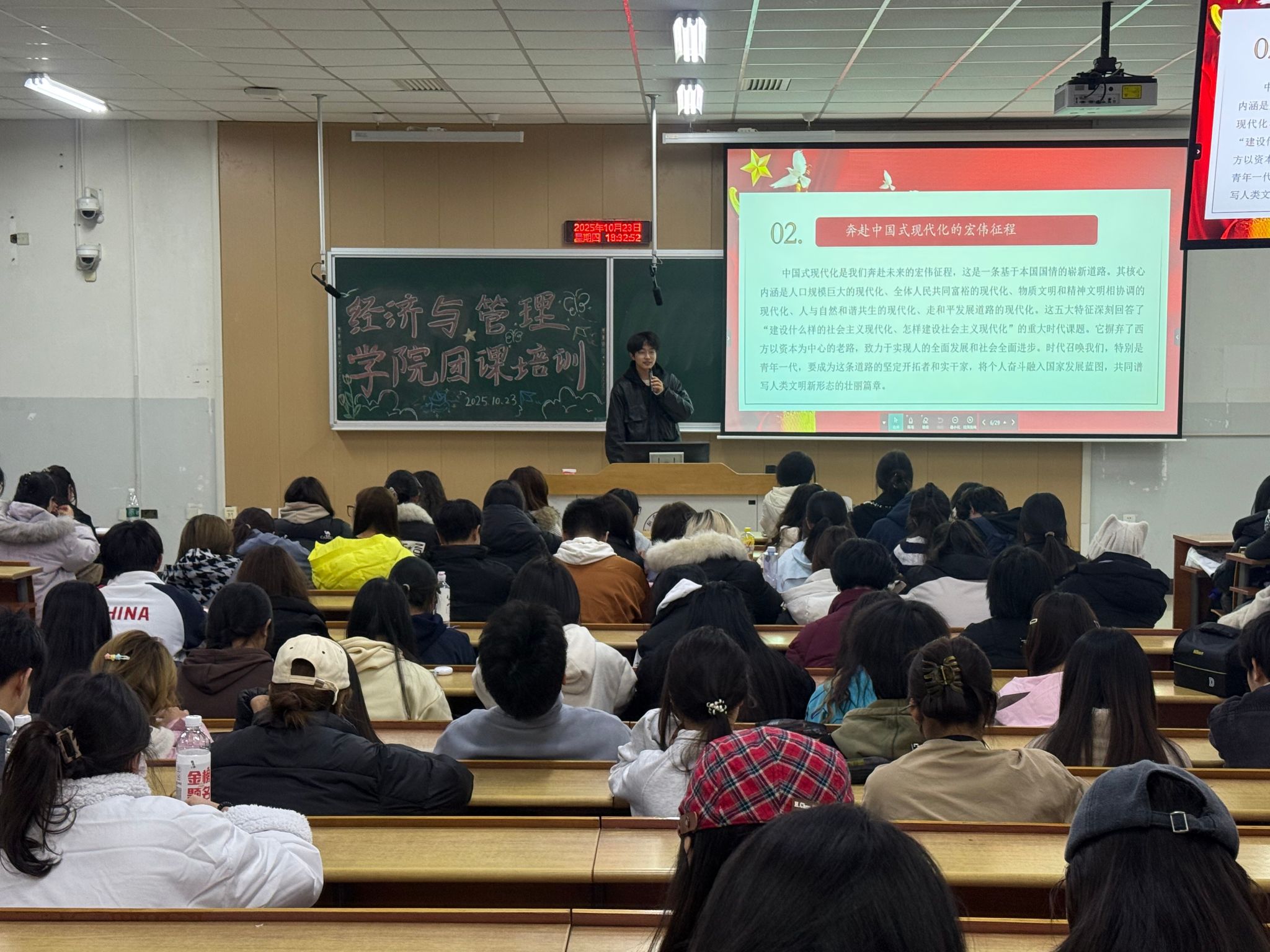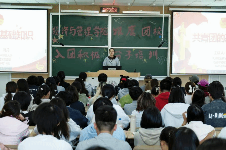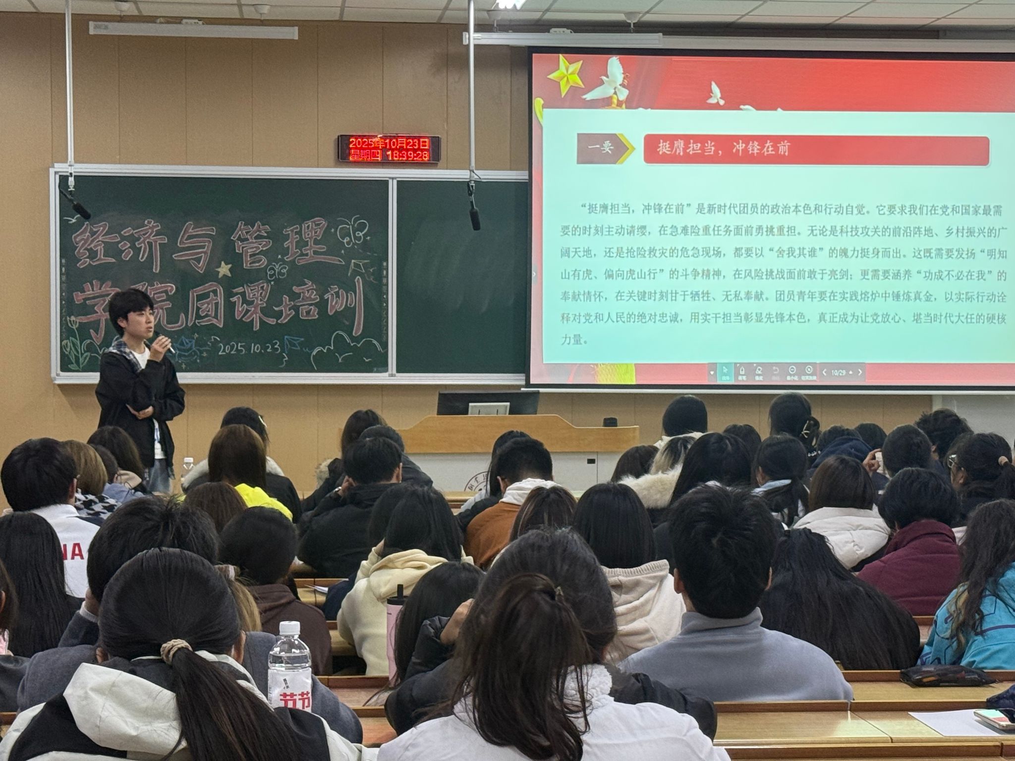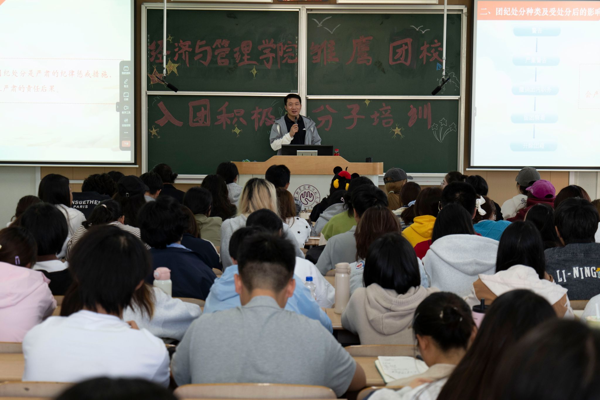 本网讯【通讯员 闫丹】为深入贯彻落实共青团组织建设工作要求,切实加强对入团积极分子的思想引领和组织培养,10月14日至24日,经济与管理学院在第三教学楼开展“雏鹰团校”入团积极分子系列培训。学院团委书记闫丹、马克思主义学院教师武培培、辅导员殷天皓、优秀共青团员代表李春滔、优秀学生干部代表蒋明霖为130余名入团积极分子开展培训。