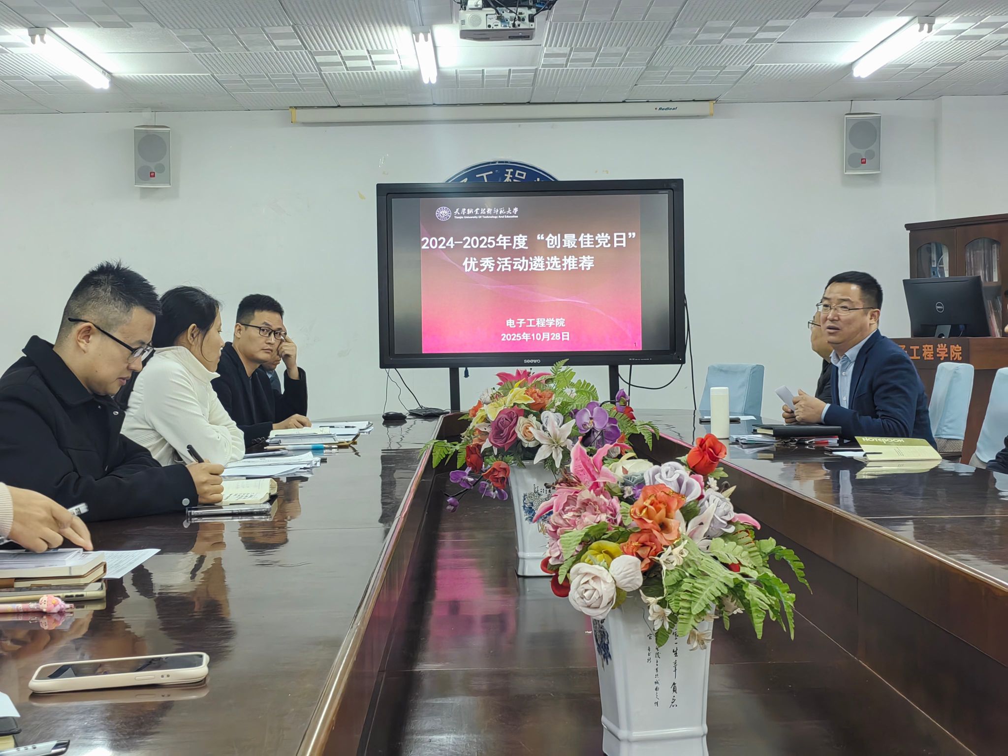 本网讯【通讯员 余波】为进一步深化基层党支部标准化规范化建设,激发基层党支部的战斗堡垒作用,10月28日,电子工程学院党委在机电楼326会议室召开2024-2025年度“创最佳党日”活动评选会。院党委书记韩树明主持会议,学院党支部书记与专职组织员参加,16个党支部逐一汇报展示。