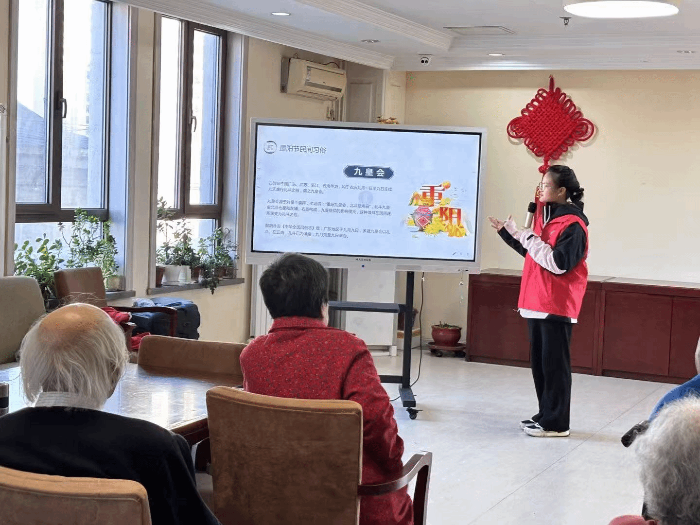 在轻松愉快的交流后,志愿者结合多媒体形式,为老人们带来一场生动的传统文化分享。通过图文并茂的PPT展示,同学们以通俗易懂的语言,介绍了中国传统节日的文化内涵与相关养生知识,增强老人们健康生活的意识。