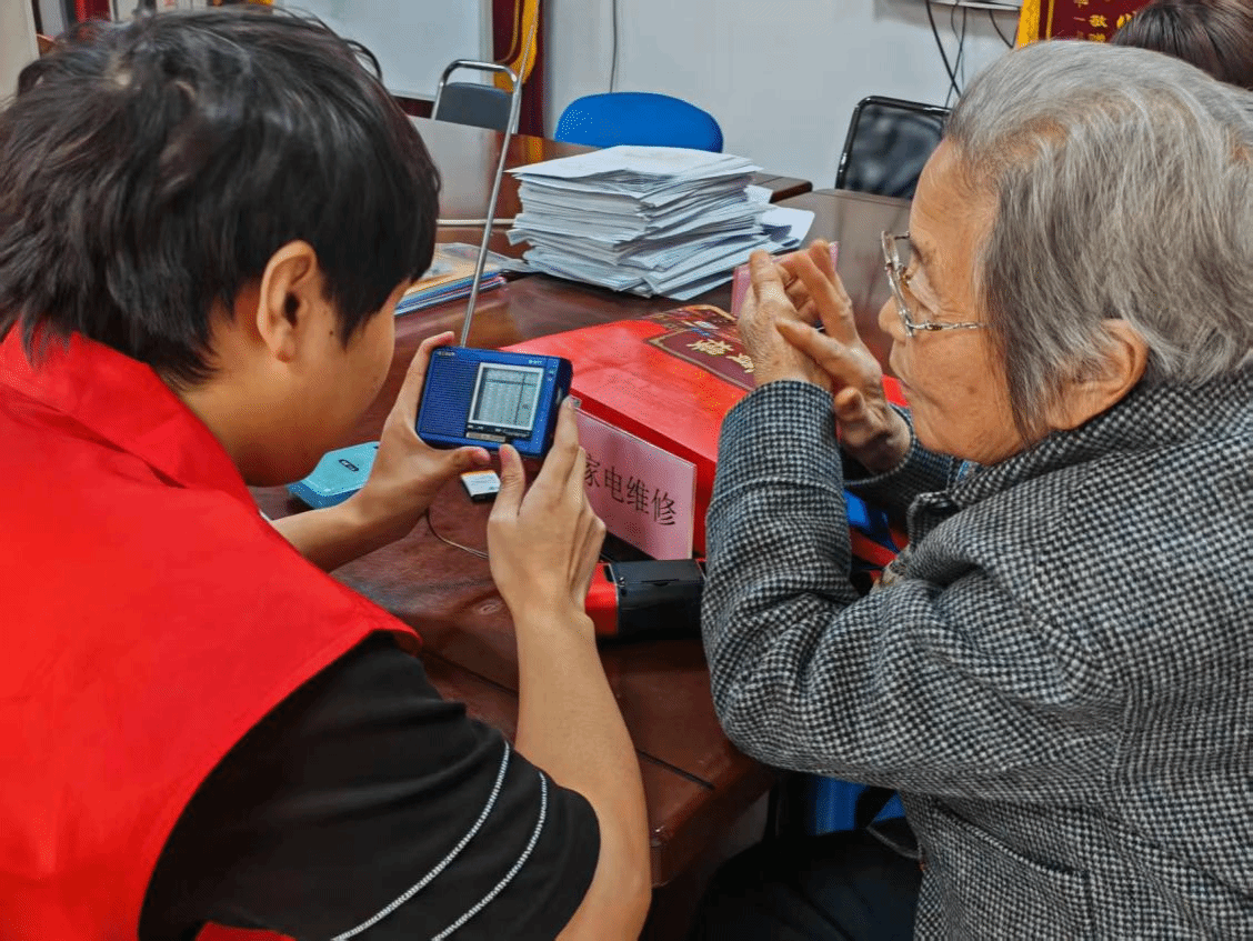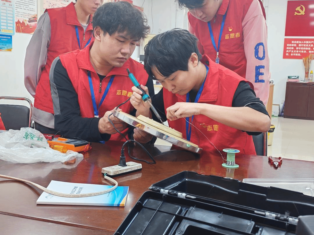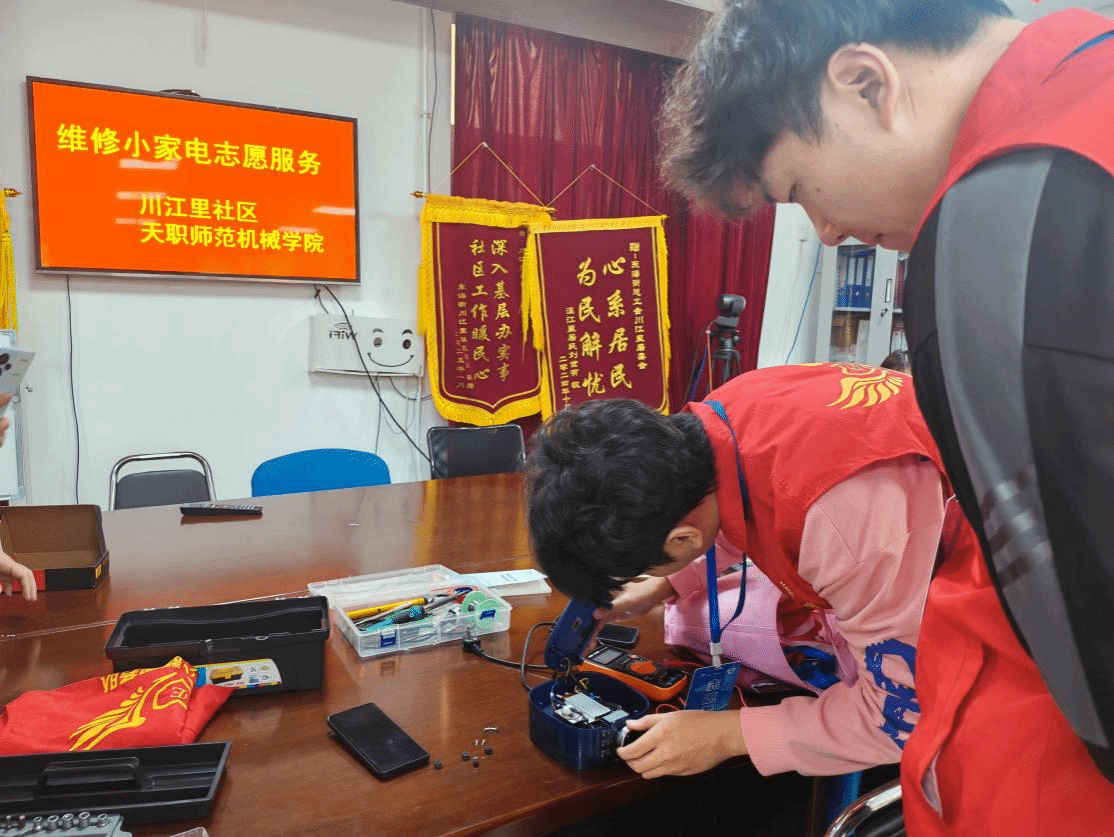 活动现场气氛热烈而有序,志愿者们分工明确,有的负责登记信息、耐心询问故障情况;有的手持万用表等专业工具,专注地进行检测与维修;还有的向居民讲解小家电的日常使用和保养知识。他们严谨认真的态度和热情周到的服务,成为了社区里一道亮丽的风景线。