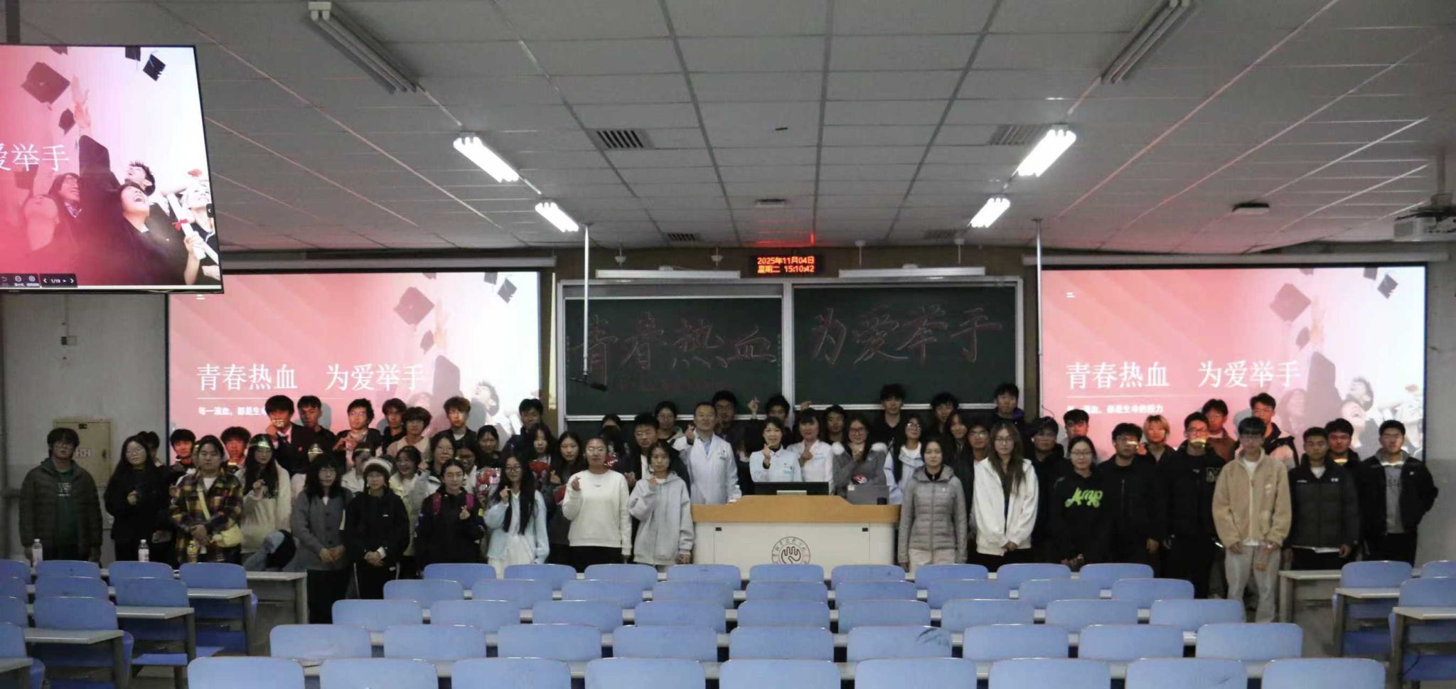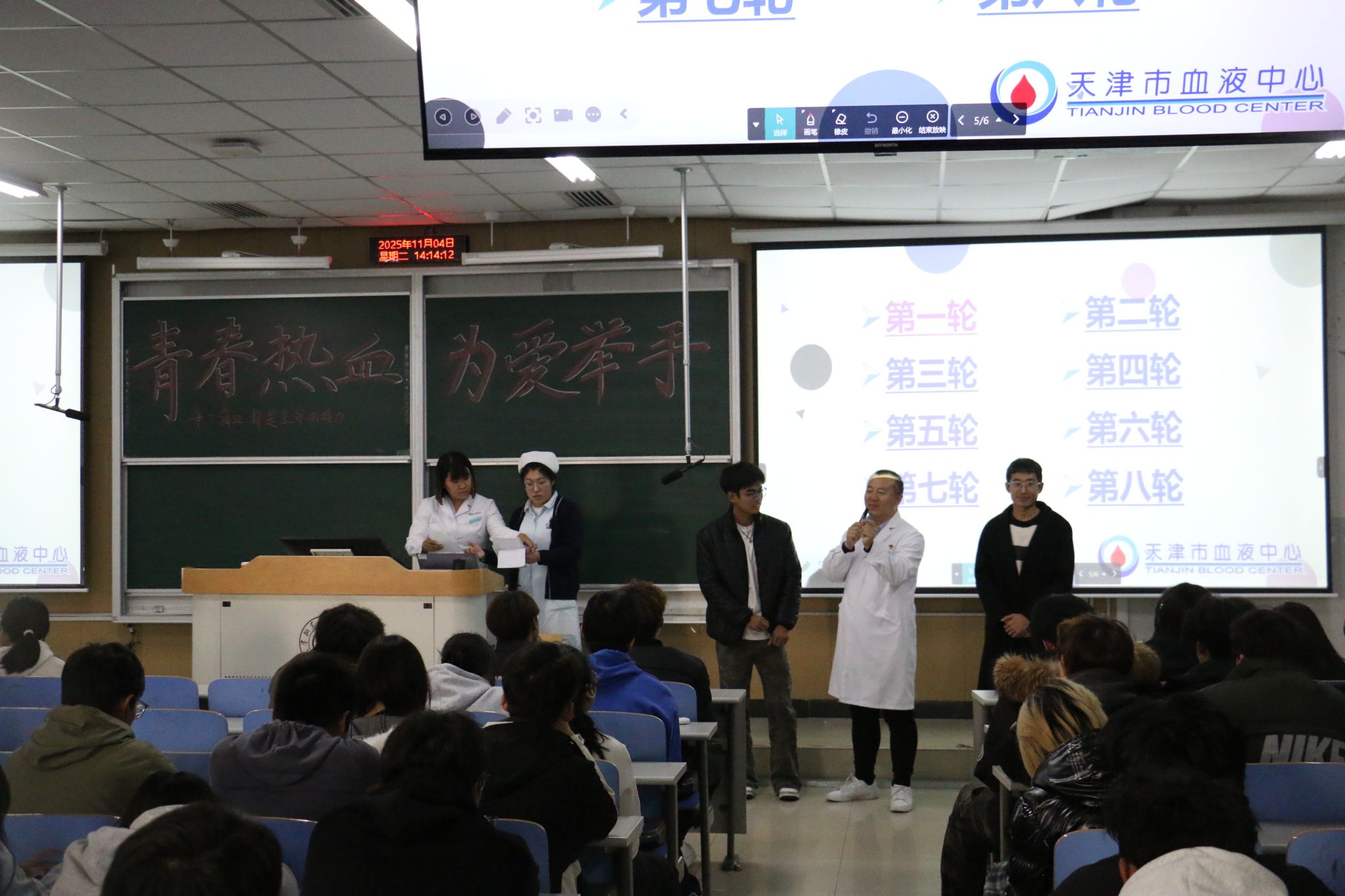 本网讯【通讯员 王希】为打破传统认知壁垒,点燃青年学子的公益热忱,11月4日,我校在第二教学楼举办“青春热血·为爱举手”无偿献血主题讲座。本次活动邀请天津市血液中心资深医师彭云杰、李杨担任主讲,以沉浸式体验、互动式答疑、故事化分享的创新形式,让无偿献血知识真正走进青年心间,200余名师生到场参与活动。