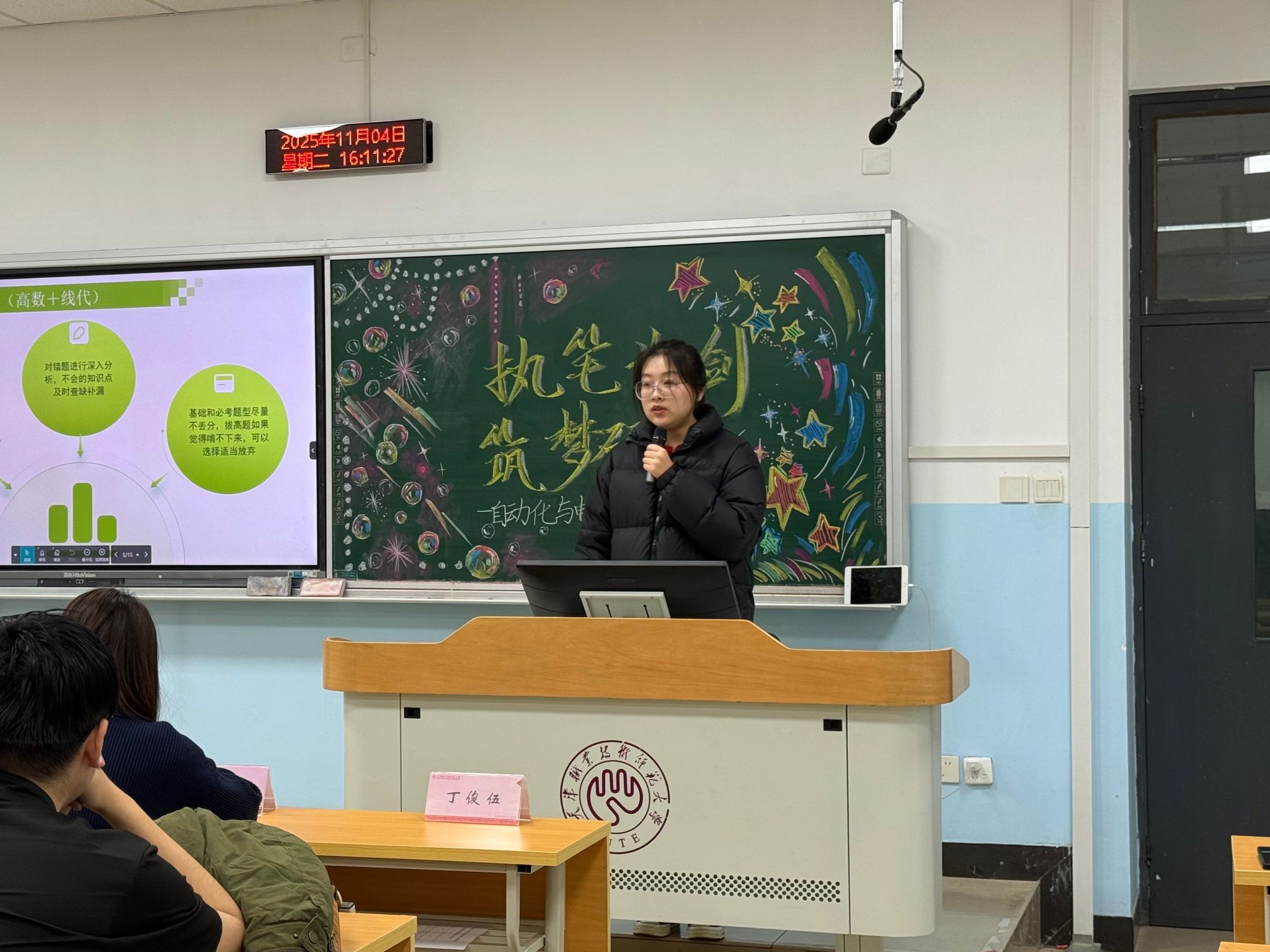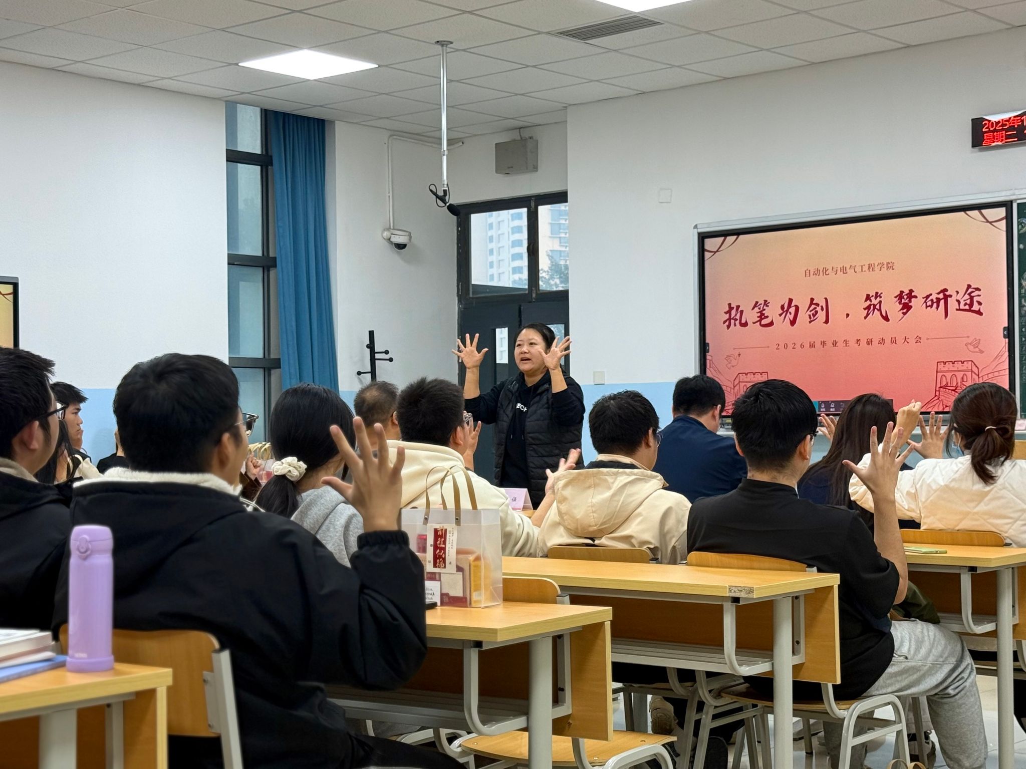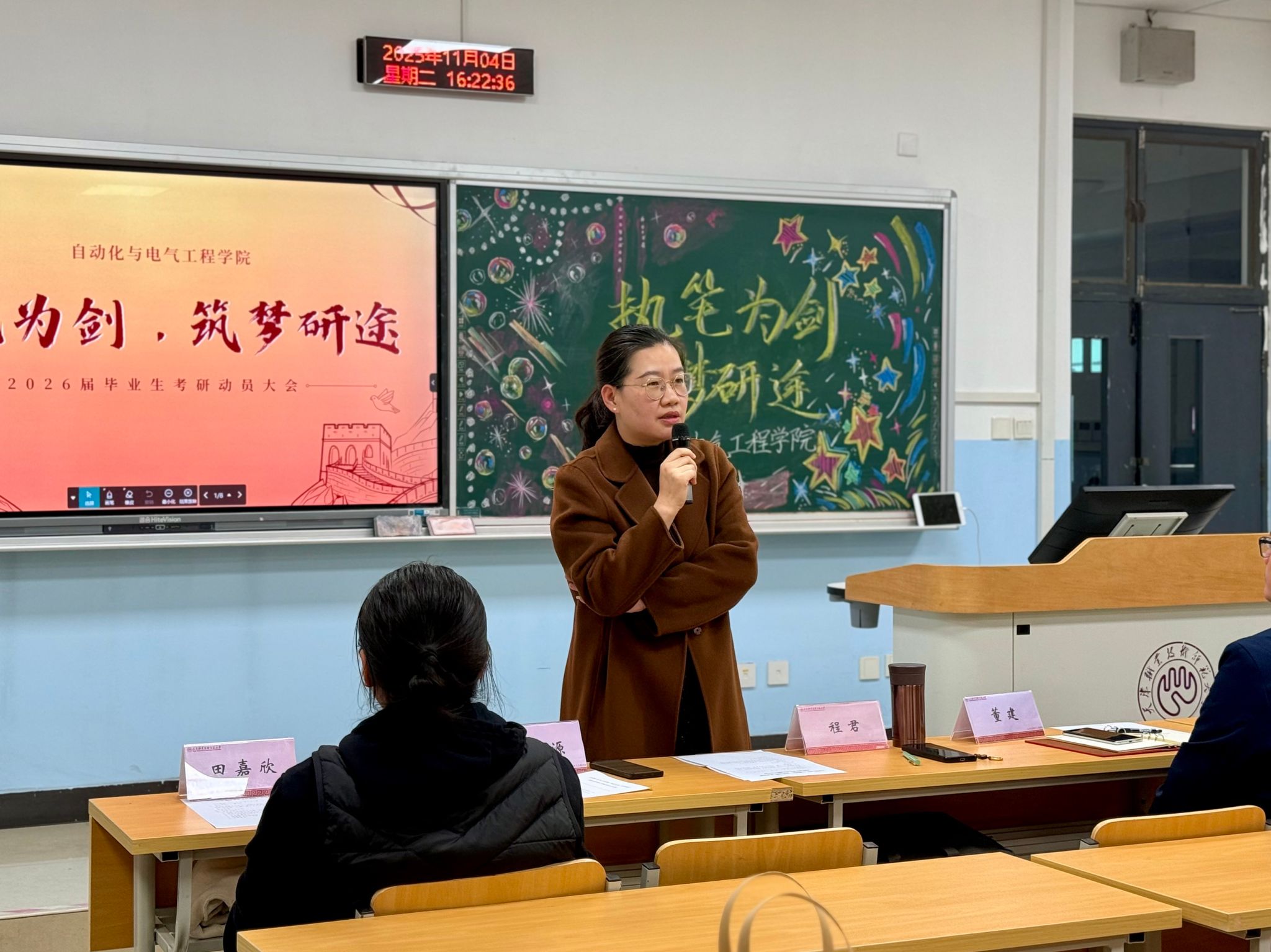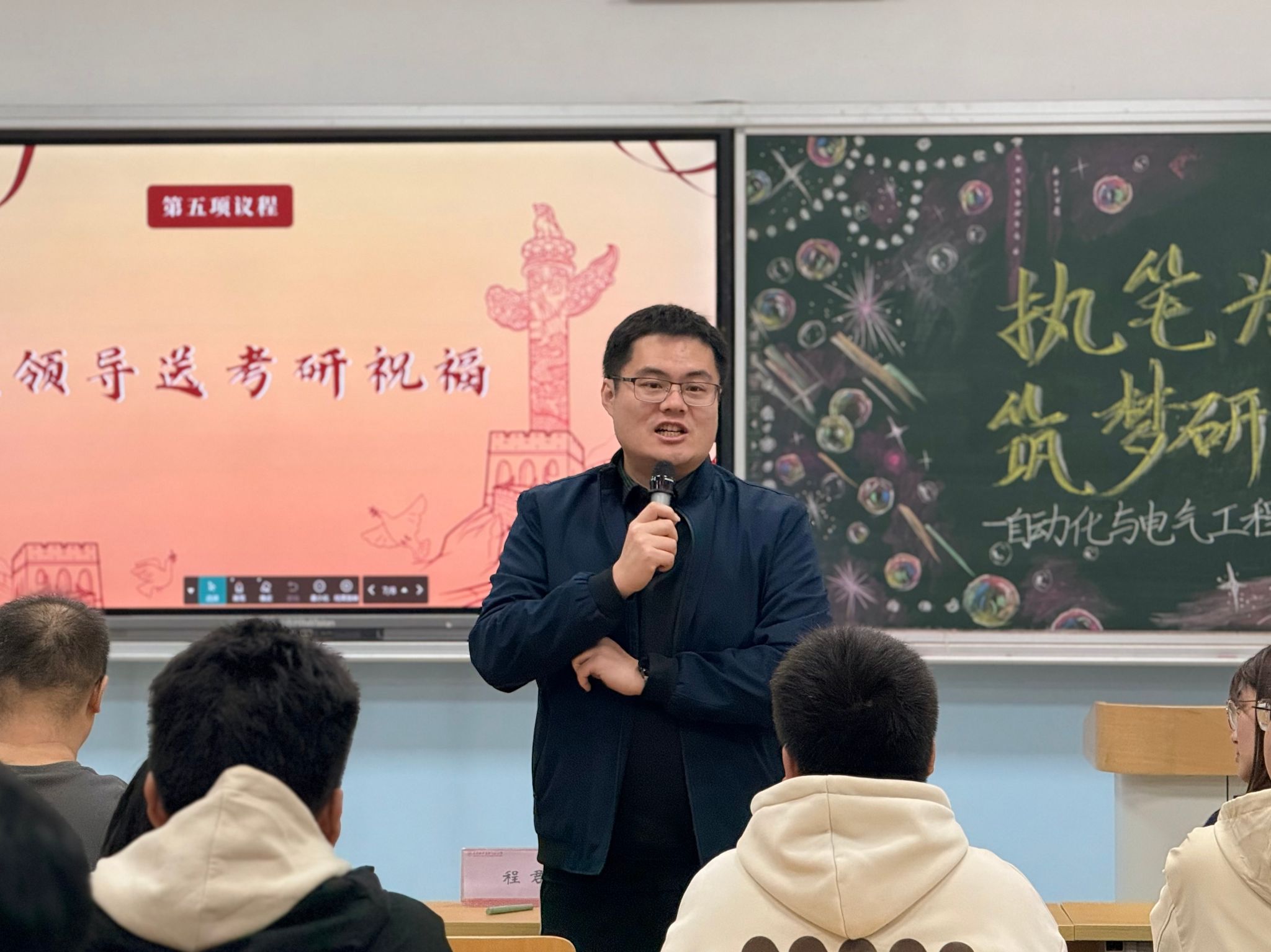 本网讯【通讯员 王珊 王子琰】为精准对接考研学子需求,明晰备考方向,缓解心理压力,11月4日,自动化与电气工程学院在二教207教室开展“执笔为剑,筑梦研途”2026届考研学生慰问活动。院党委副书记程君,副院长董建代表学院领导班子莅临现场对考研学子进行慰问,辅导员田嘉欣、丁俊伍、李泓源、王珊,研究生代表朱彦洁及2026届考研毕业生代表参加了本次活动。