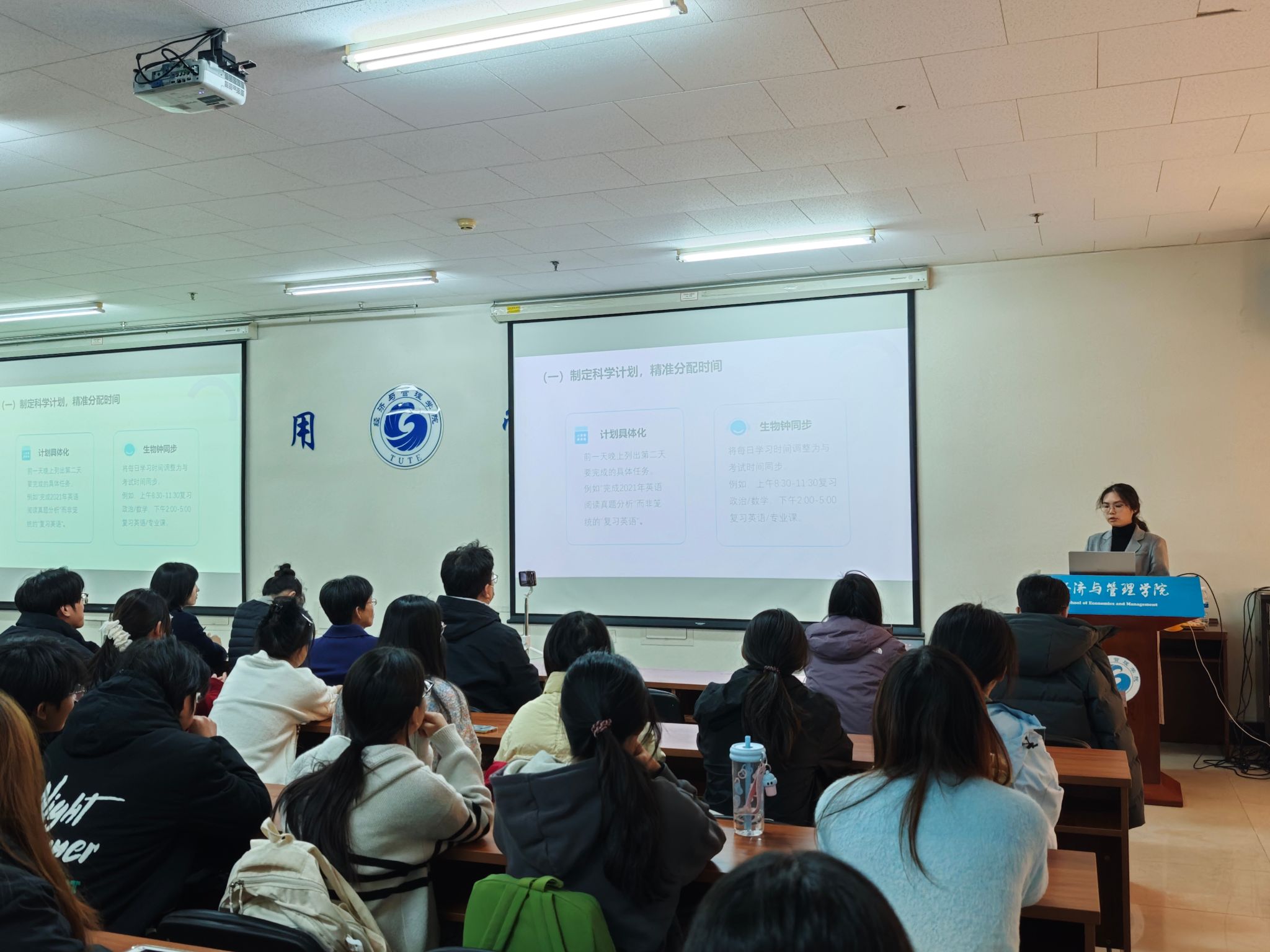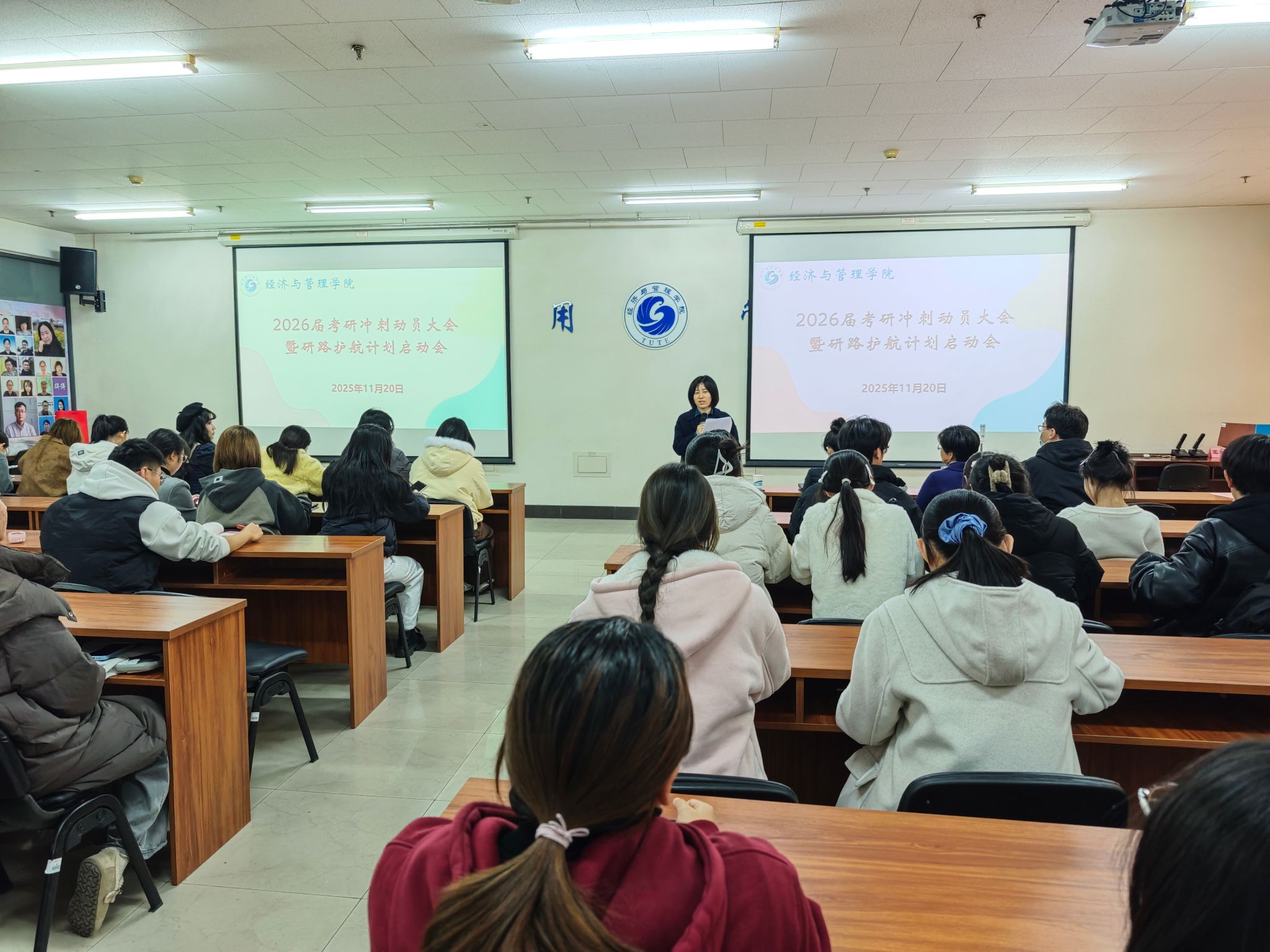 本网讯【通讯员 殷天皓】冬日砺剑,蓄势待发;研途护航,温暖同行。11月20日下午,经济与管理学院在第一教学楼701室举行2026届毕业生考研冲刺动员大会暨“研路护航计划”启动会。学院党委书记刘晶、副书记郭丽芳、考研帮扶教师代表、毕业班辅导员、考研升学校友代表、在校研究生代表及2026届考研学生代表参会。