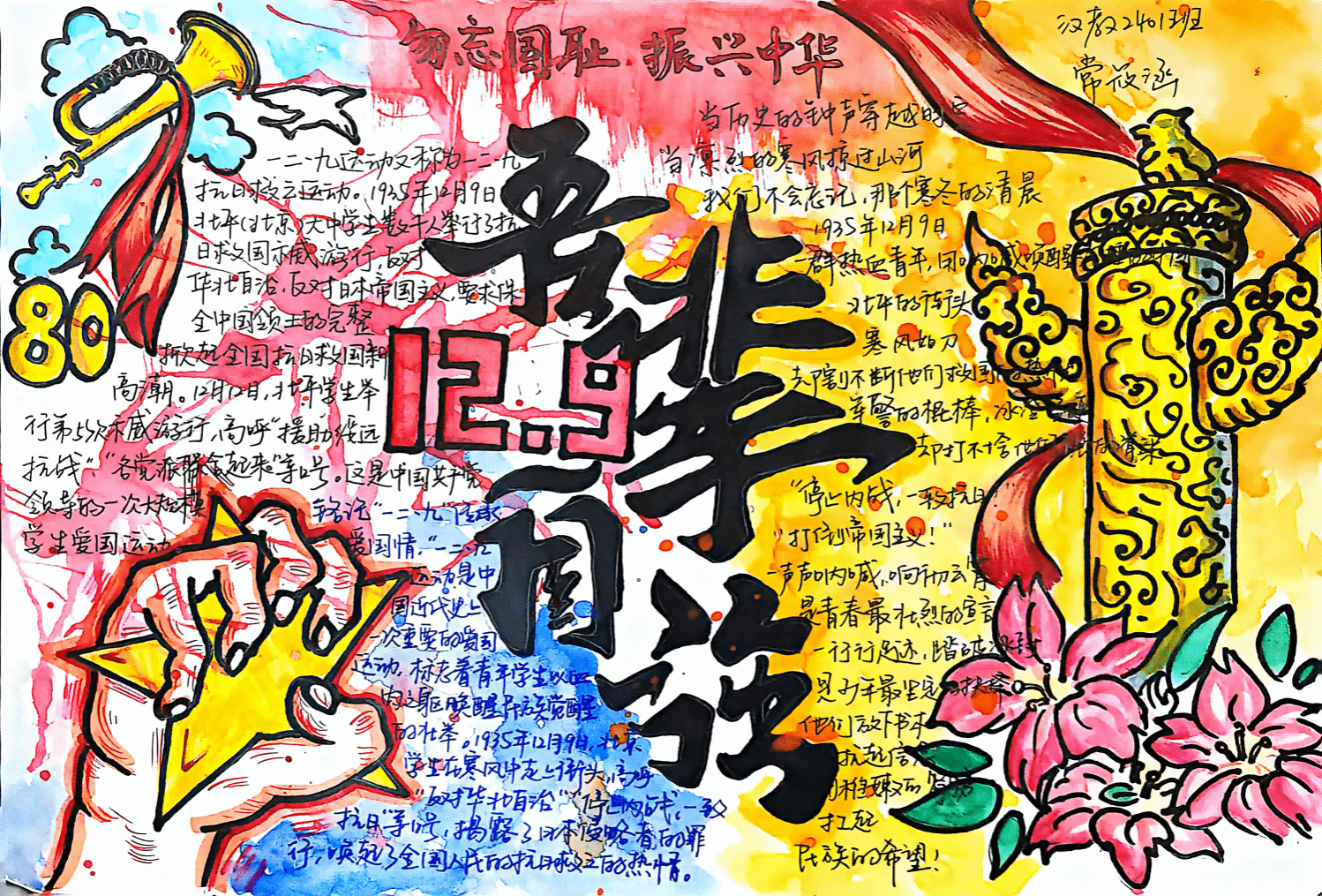 活动自12月4日启动以来,全院学生积极响应,以笔为媒、以画为语,将对“一二·九”运动历史的理解、对爱国精神的感悟融入手抄报创作中。作品内容丰富多元,既有对“一二·九”运动历史背景、重要意义的文字阐述,也有对革命先辈爱国壮举的生动刻画,更有新时代青年立足专业、报效国家的青春誓言。