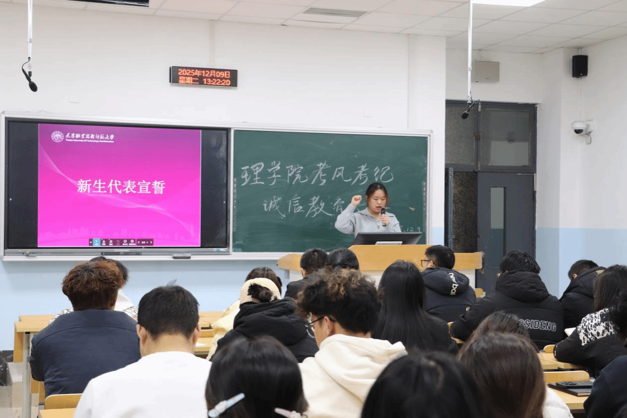 为深化诚信理念,大会设置新生代表宣誓环节。新生代表物理2502班学生沙金淼庄严宣誓,承诺严守考试纪律、抵制作弊行为,维护考试公平。针对备考压力调节问题,同学们相互分享解压方法,现场气氛热烈。