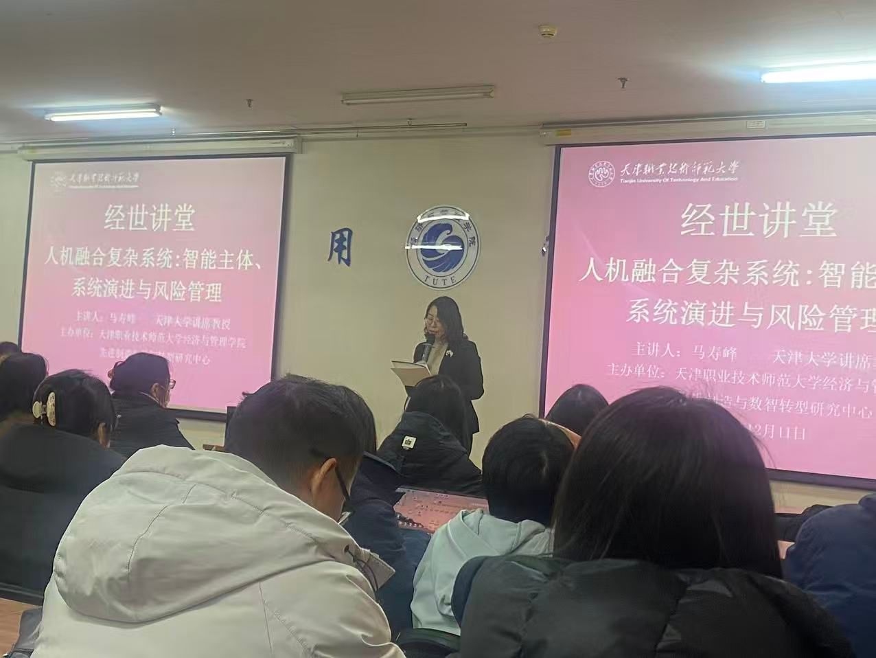 本网讯【通讯员 主孟凡 李彤】12月11日,经济与管理学院在第一教学楼701室举办“经世讲堂”第十九讲。本次讲座以“人机融合复杂系统智能主体、系统演进与风险管理”为主题,特邀天津大学马寿峰教授担任主讲。院长齐莉丽,副院长董树功、齐旭高,部分专任教师及研究生参会,会议由齐莉丽主持。