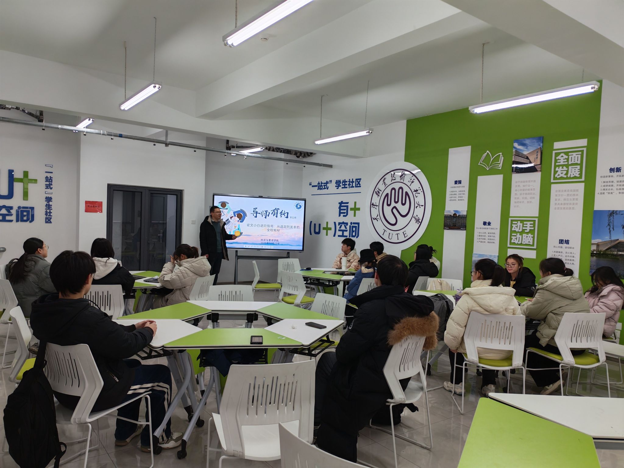 本网讯【通讯员 闫丹】为帮助学生破解科研入门难题,明晰论文写作逻辑,提升学术创新能力与科研实践素养,12月12日,经济与管理学院在东区U+空间举办第五期“导师有约”活动。本次活动特邀金融系副主任张志鹏老师主讲,以“论文小白进阶指南——从选题到发表的全程揭秘”为主题,系统拆解本科生论文撰写的核心要点与实践路径,为有志于发表学术论文的本科生搭建高效学习交流平台。