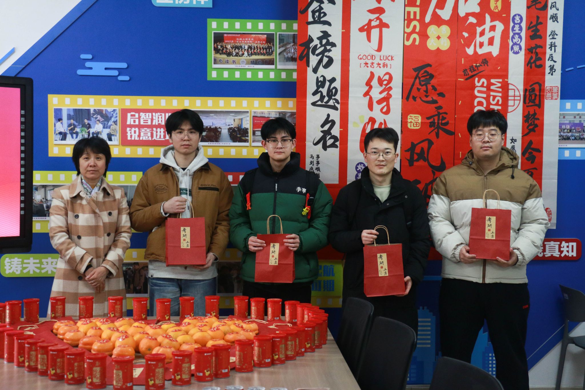 活动现场设置“能量补给站”,院领导亲手将定制化考研物资逐一发放至学生手中。这份精心筹备的“能量套餐”暗藏巧思:印有“一研为定”的可乐罐和标注“薯你最强”的薯愿桶寓意“乐见曙光”,为学子补充备考能量;金黄饱满的柿子和橙子寓意“心想事成”,寄托着对学子披荆斩棘的美好期许;而每张全体辅导员手写的祝福卡则承载着学院的殷切厚望,字里行间满是“研途必胜”的真挚鼓励。“可乐罐上的考研祝福语很贴心,老师们手写的‘保持节奏,稳扎稳打’更是让我倍感温暖与动力。”2026届机械设计制造及其自动化专业的袁同学手捧物资,难掩激动之情。