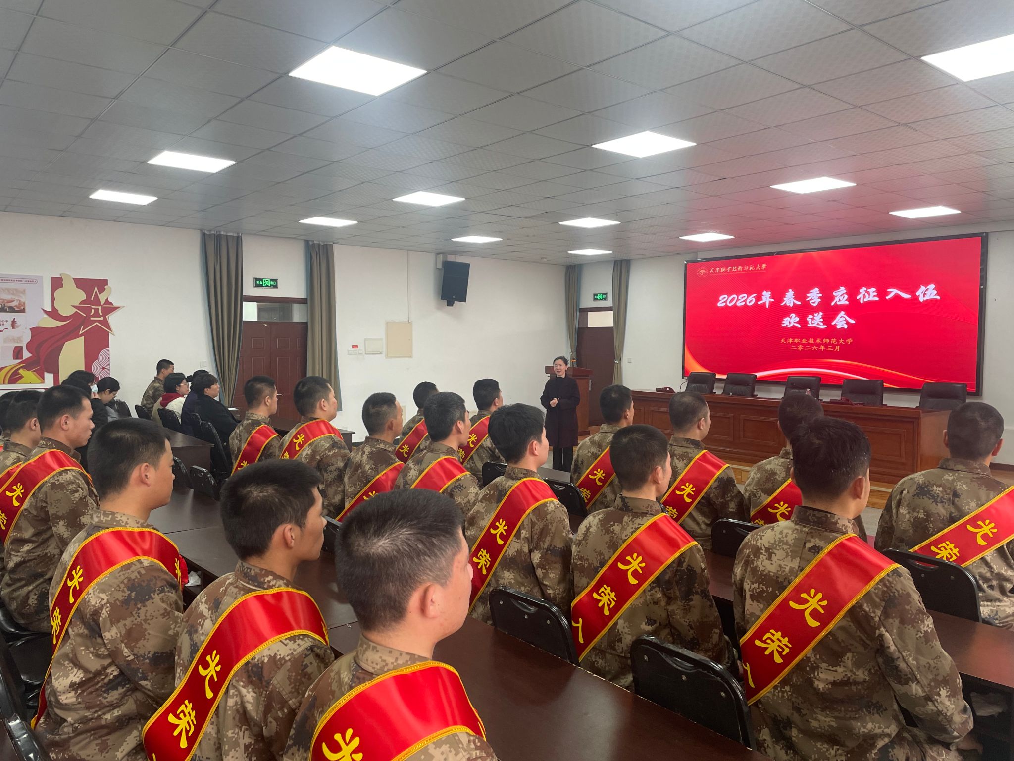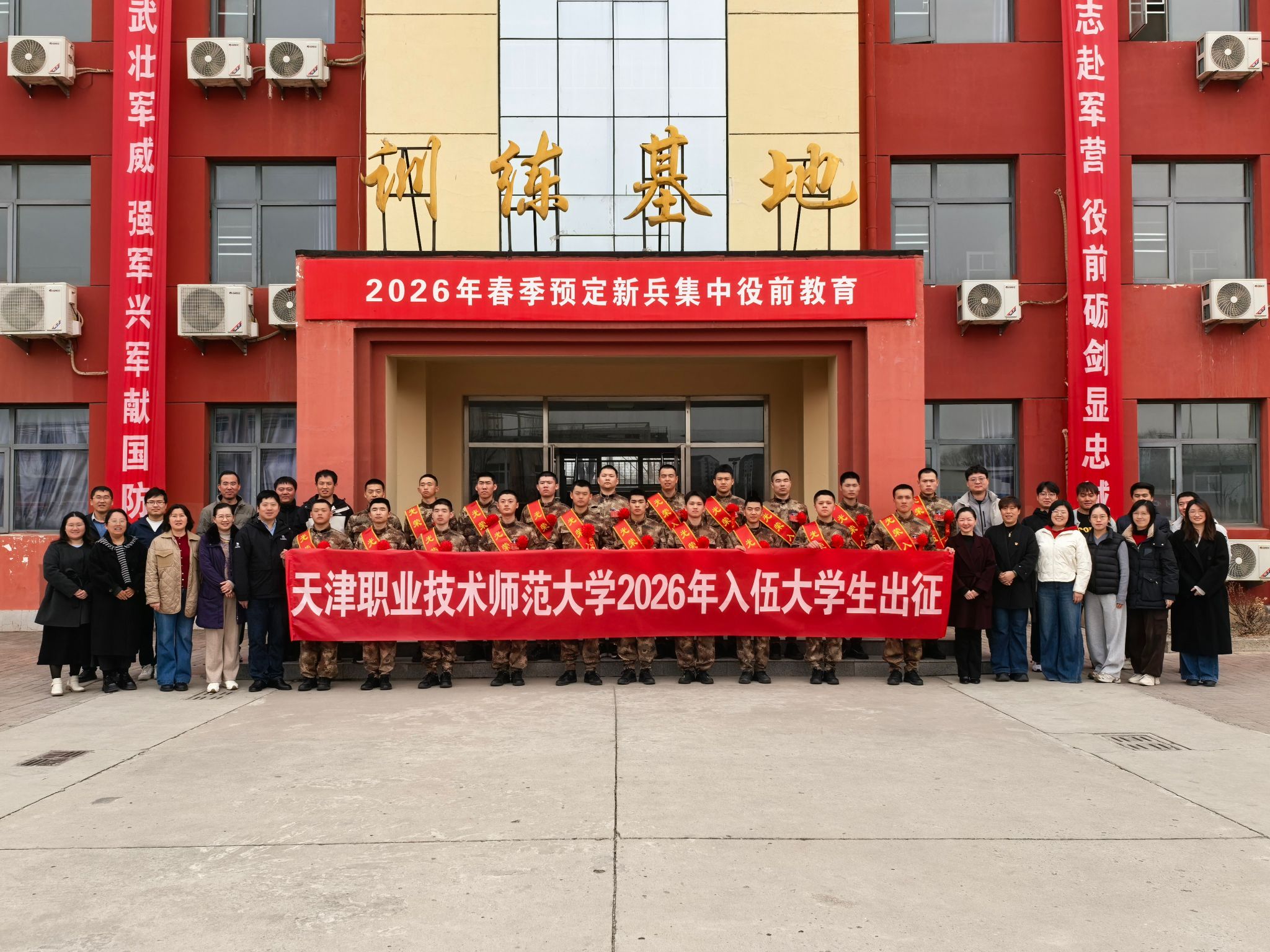 本网讯【通讯员 朱文祥 车越新】青春筑梦强军路,热血担当报国情。3月13日上午,我校2026年春季大学生参军入伍欢送仪式在东丽区役前教育基地举行。党委学生工作部、武装部相关领导,各学院党委副书记及辅导员出席仪式,为即将奔赴军营的21名天职师大学子送上殷殷嘱托与美好祝福。