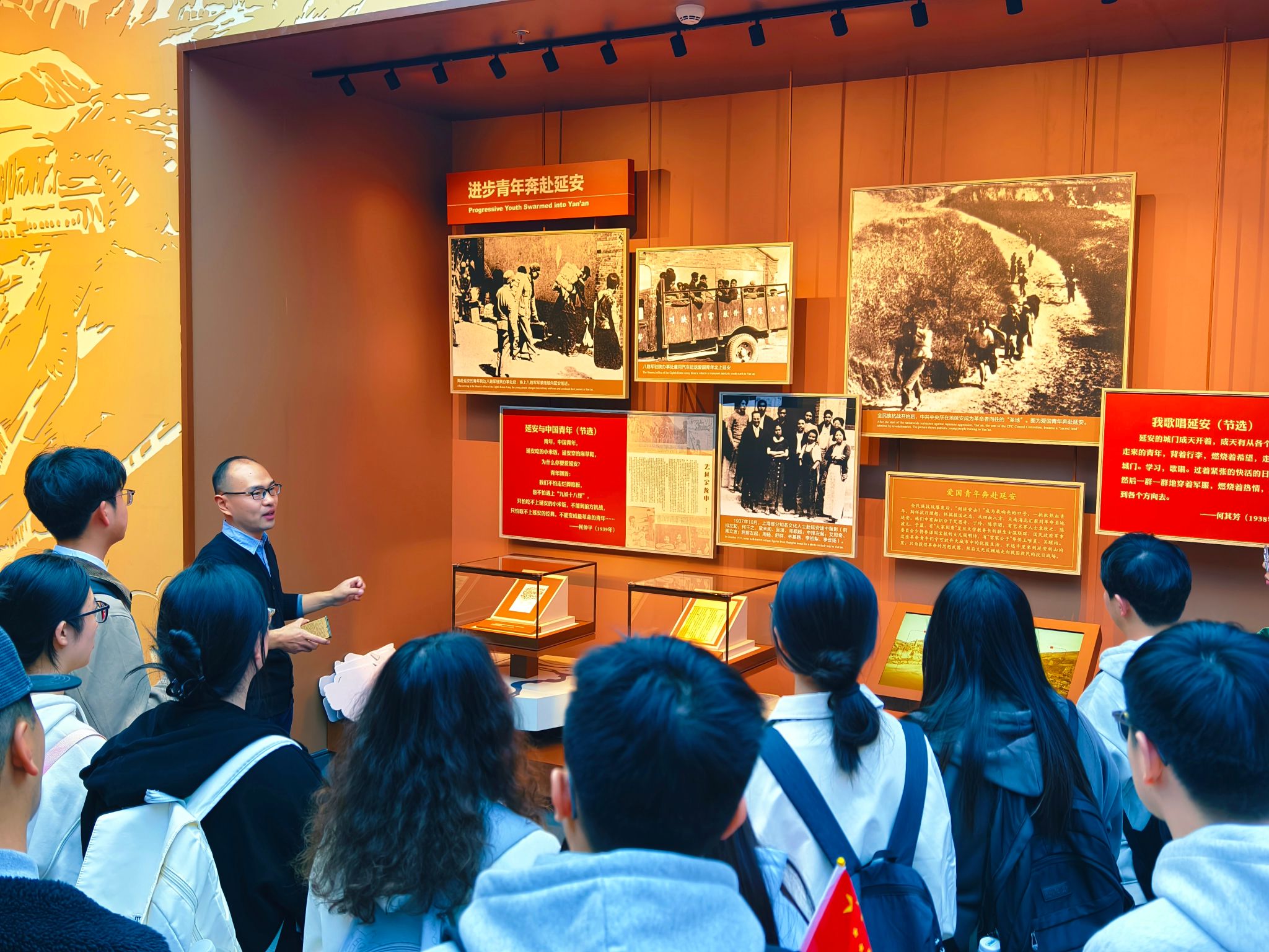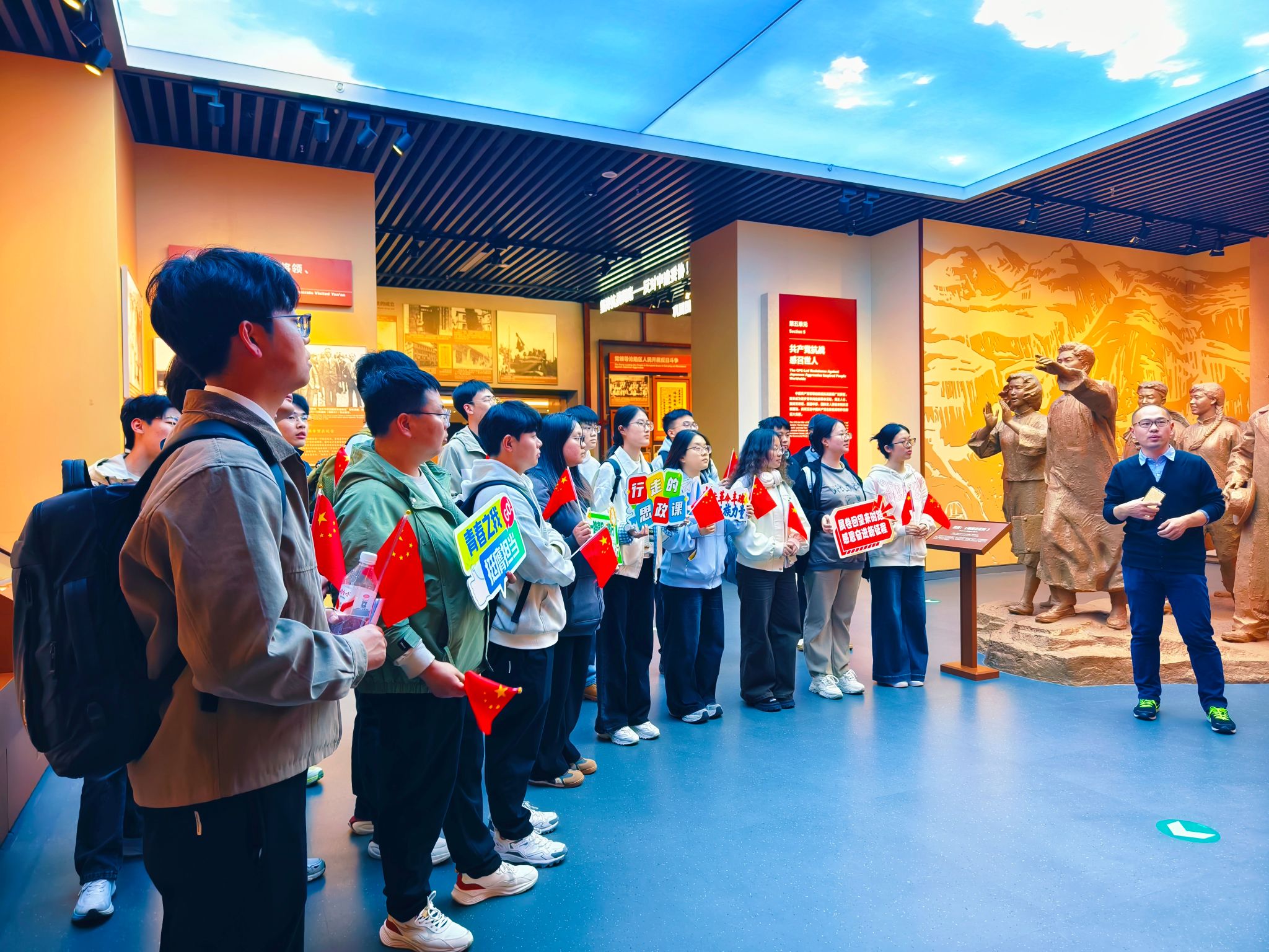在中国人民抗日战争纪念馆中,师生依次参观“铭记历史、缅怀先烈、珍爱和平、开创未来”主题展览,马克思主义学院王海广老师结合馆内丰富的史料与实物展陈,带来一堂《我要去延安》的沉浸式微党课,追忆无数爱国青年奔赴延安、寻求真理、坚定革命信仰、勇于冲锋陷阵的峥嵘岁月。学生们在珍贵的历史图片、饱经战火的文物、复原的战斗场景中深切感受中华儿女冒着敌人炮火共赴国难、英勇抵抗日本军国主义侵略的光辉历程。