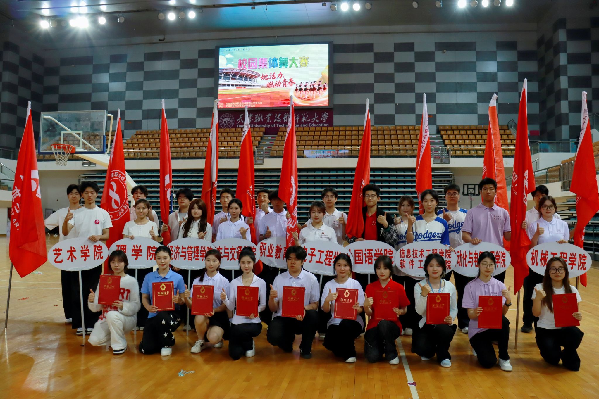 经过激烈角逐,艺术学院凭借精湛的舞技、创新的编排与深刻的主题表达,斩获本次大赛一等奖;信息技术工程学院、汽车与交通学院以鲜明的专业特色与出色的舞台表现,获得二等奖;经济与管理学院、电子工程学院、机械工程学院凭借扎实的功底与默契的配合,获得三等奖;职业教育学院、外国语学院、理学院、自动化与电气工程学院等获得优秀奖。