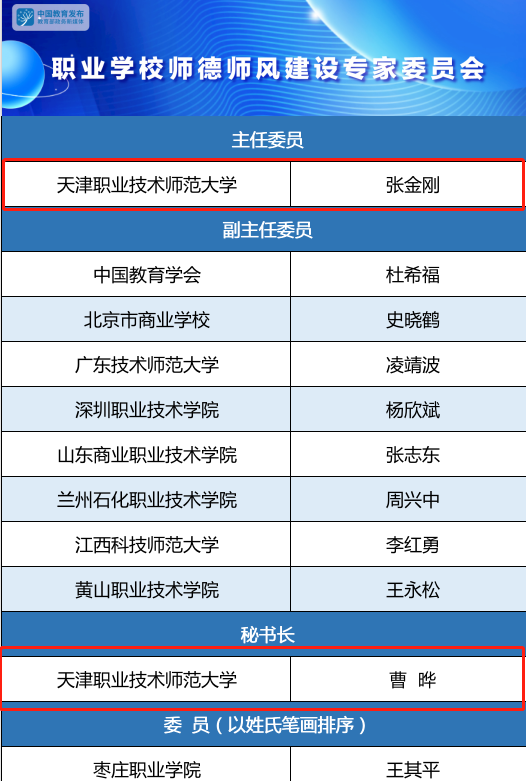 本网讯【通讯员 党萱】近日,教育部印发《教育部关于成立全国师德师风建设专家委员会的通知》,我校党委书记张金刚入选全国师德师风建设专家委员会委员,并当选为职业学校师德师风建设专家委员会主任委员,我校职业教育教师研究院院长曹晔当选职业学校师德师风建....