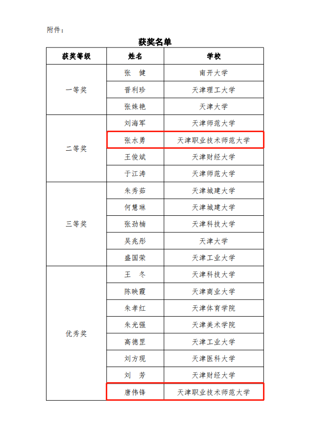 本网讯 【通讯员 李硕】近日,中共天津市教育工作委员会学生思想教育与管理处,天津市研究生思政课协同创新中心公布了“天津市2020年度研究生思想政治理论课教学展示活动获奖名单”,我校马克思主义学院教师张水勇、唐伟锋分获二等奖和优秀奖.
