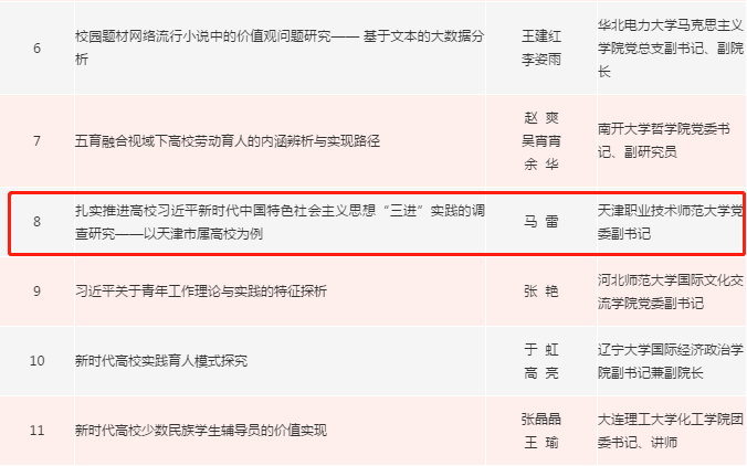 本网讯【通讯员 任聪】近日,由教育部思想政治工作司指导、《高校辅导员》编辑部主办的2020年度全国高校思想政治工作优秀论文征集活动评选结果正式公布,天津职业技术师范大学党委副书记、马克思主义学院院长马雷带领团队完成的论文《扎实推进高校习近平新时代中....